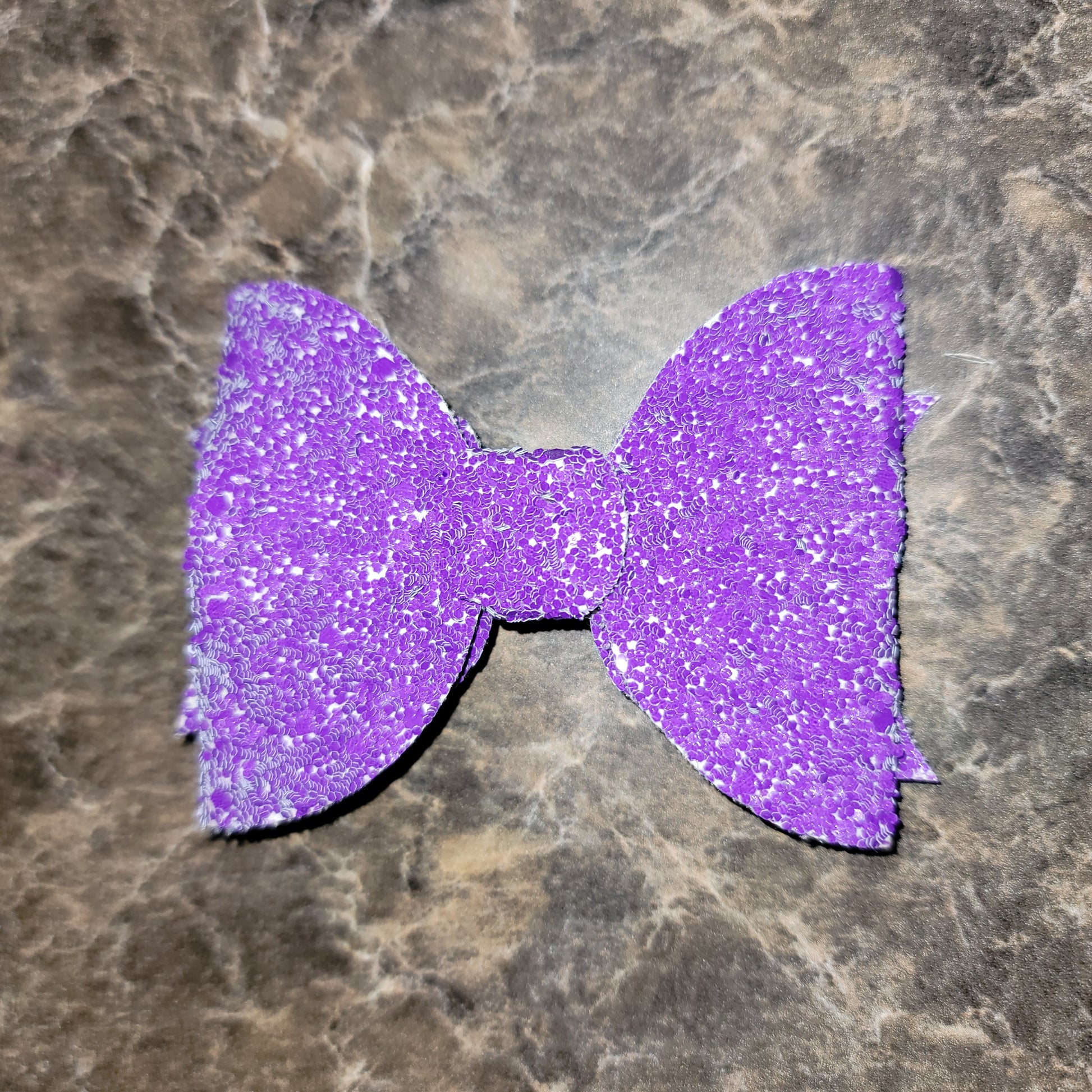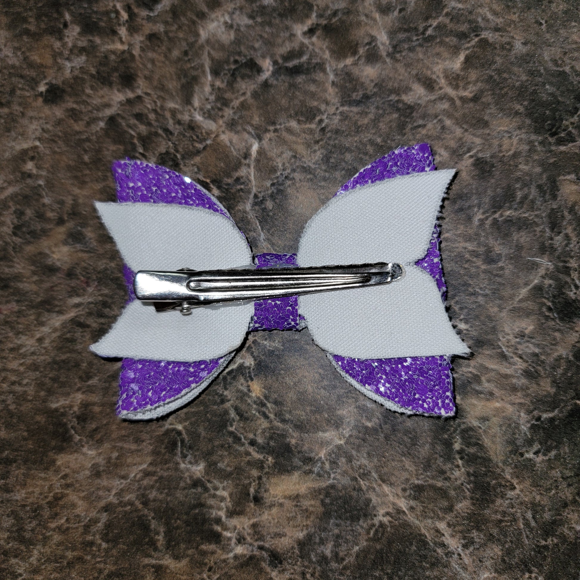 Purple glitter material with soft backing. Medium bow secured on an alligator clip.