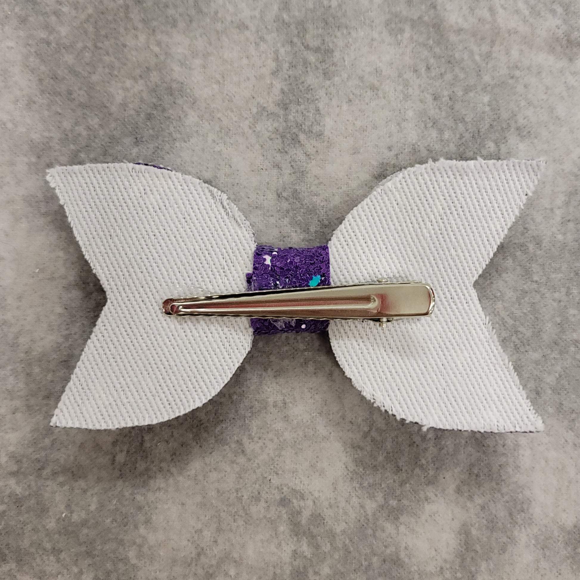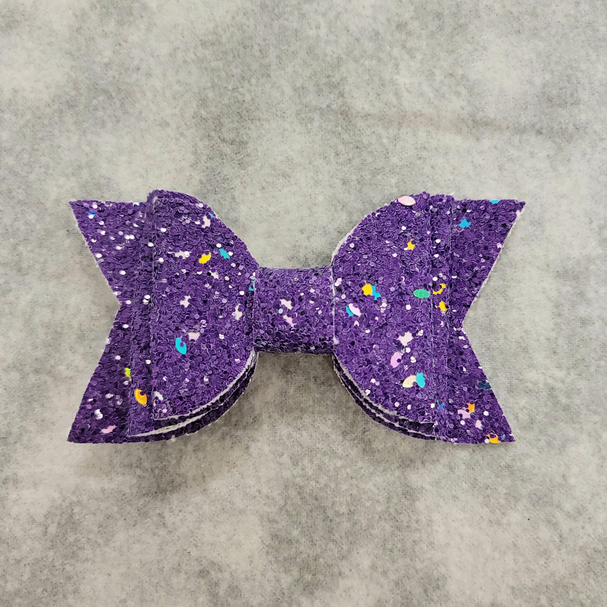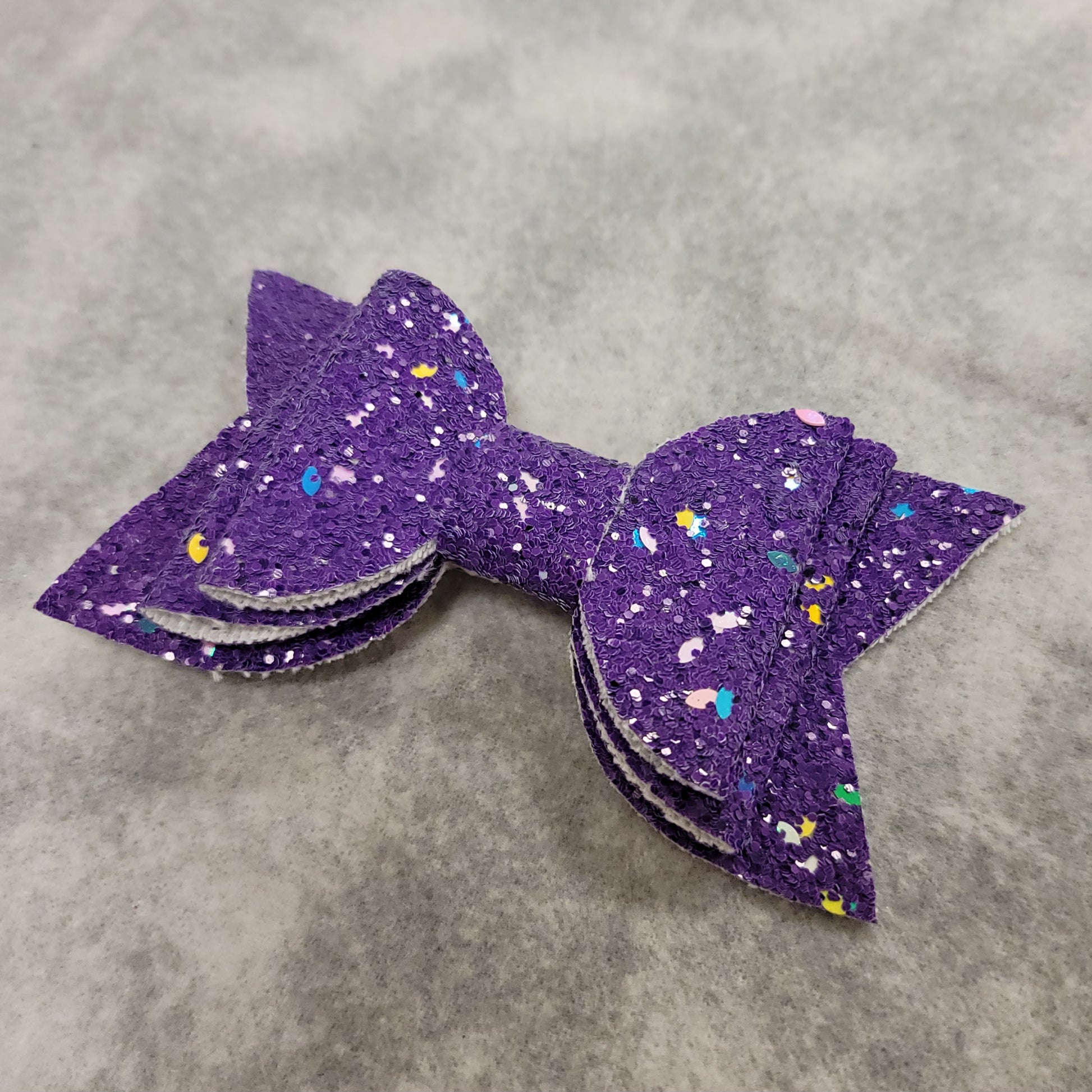 Purple with multicolor glitters material with soft backing. Double stack large bow secured on an alligator clip.