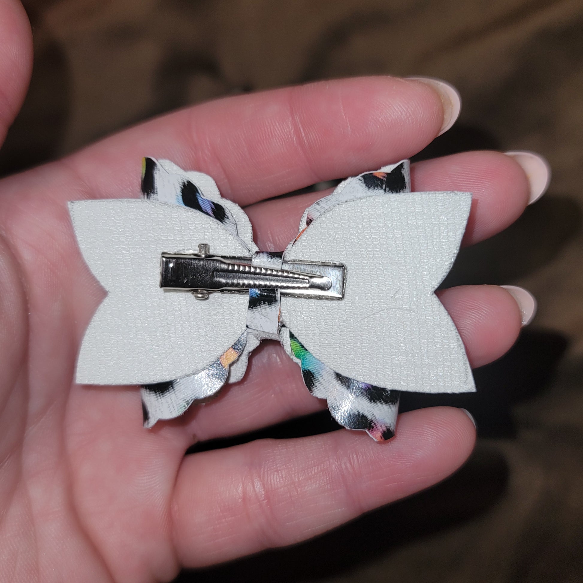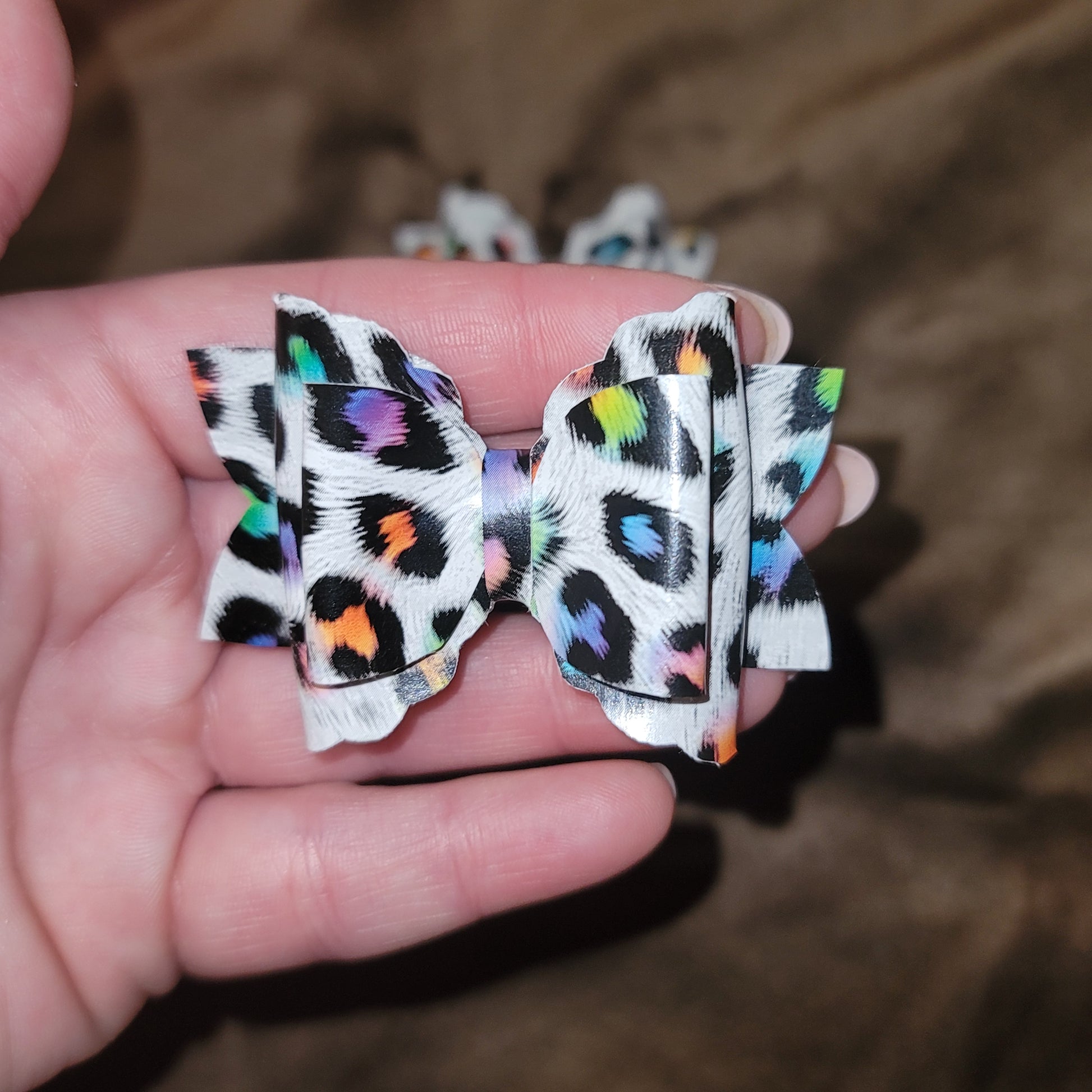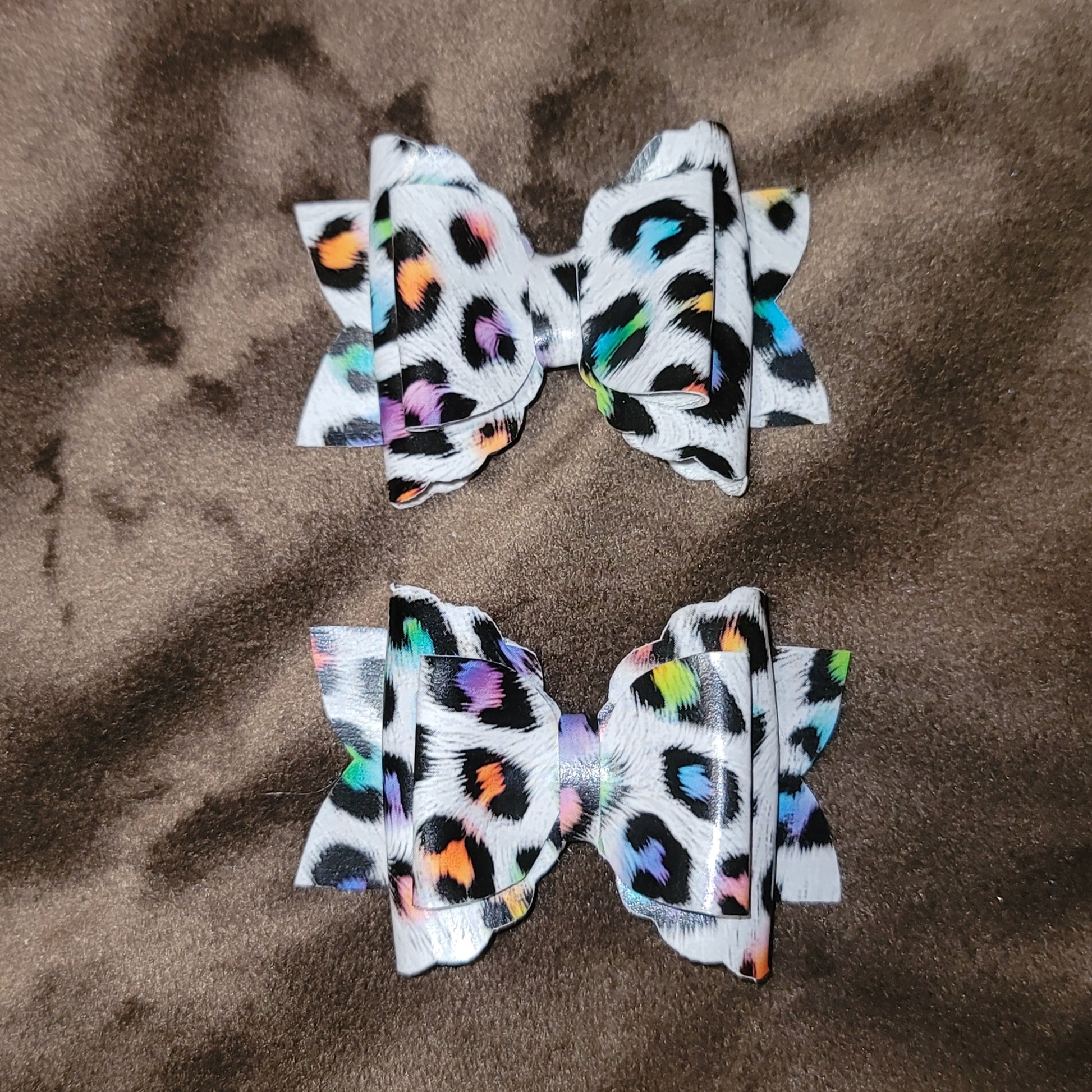 Rainbow cheetah print faux leather. 2.5 inch Lou Lou bows. Secured on alligator clips.