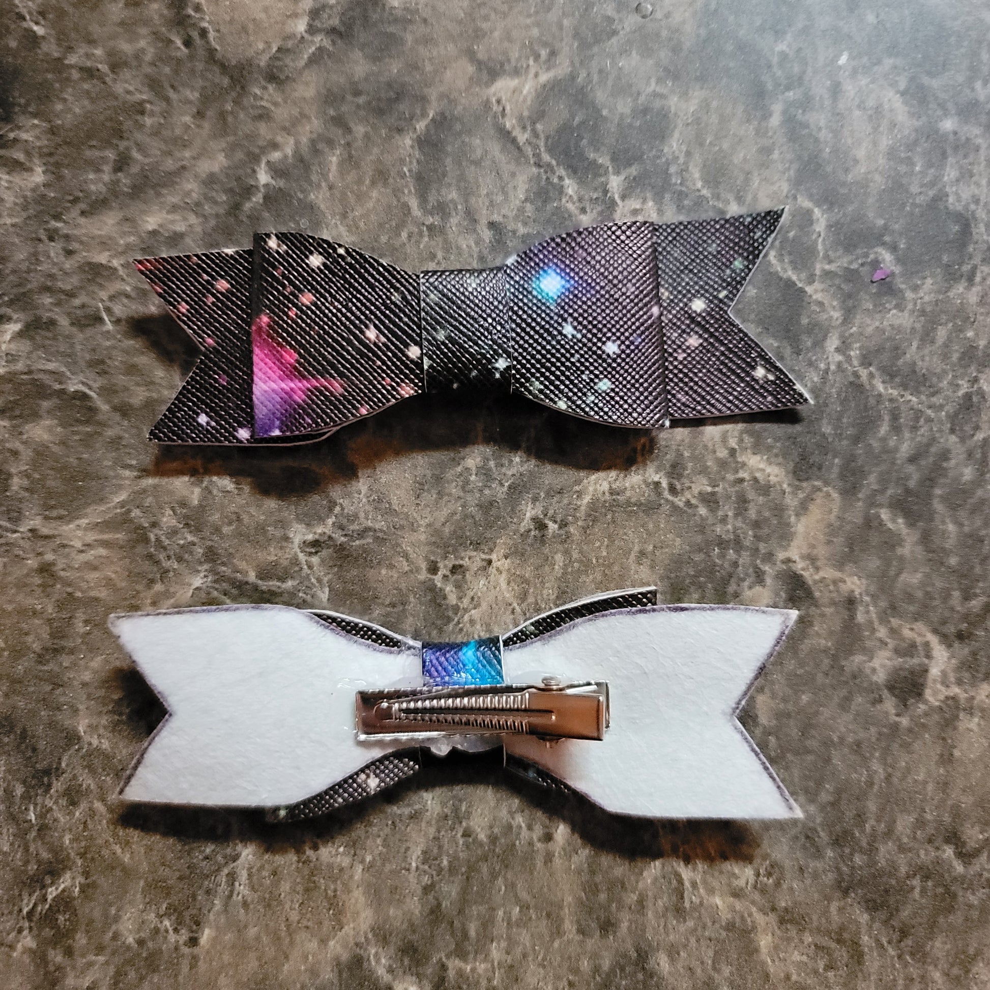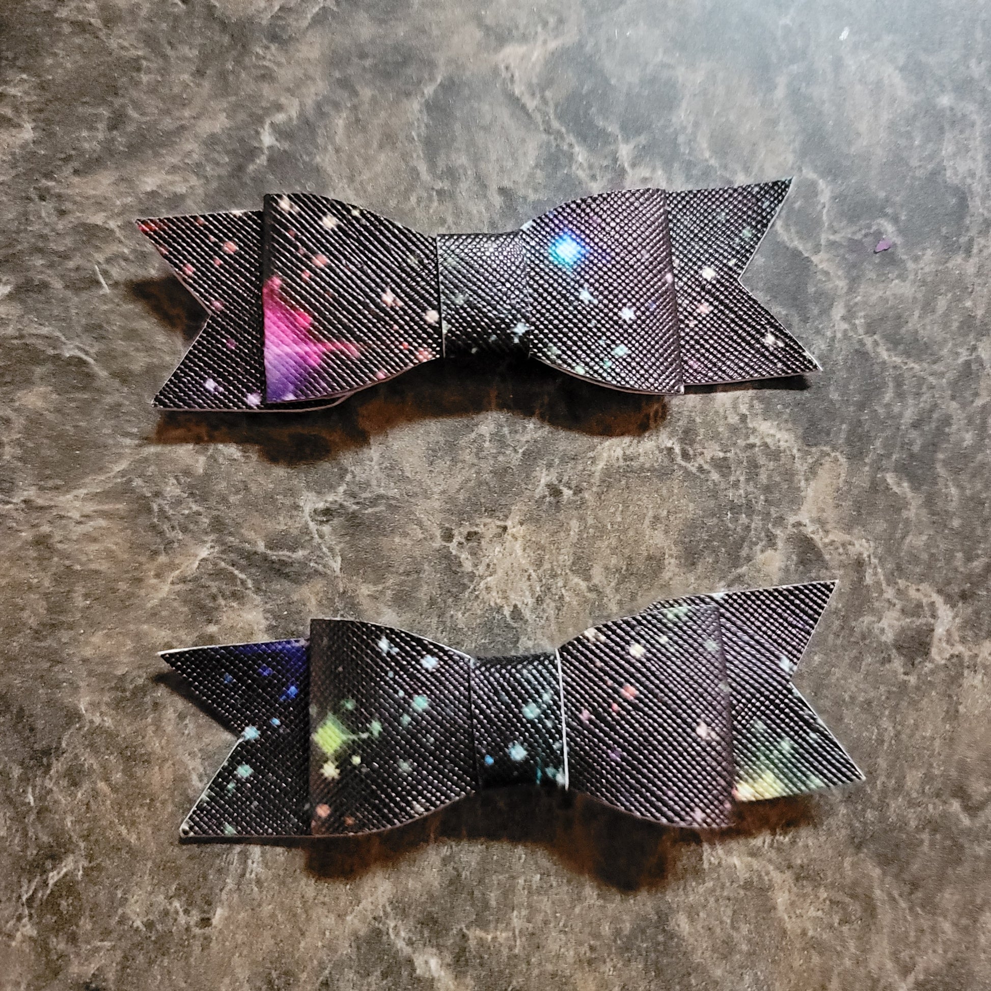 Rainbow galaxy print faux leather. Bows secured on alligator clips.