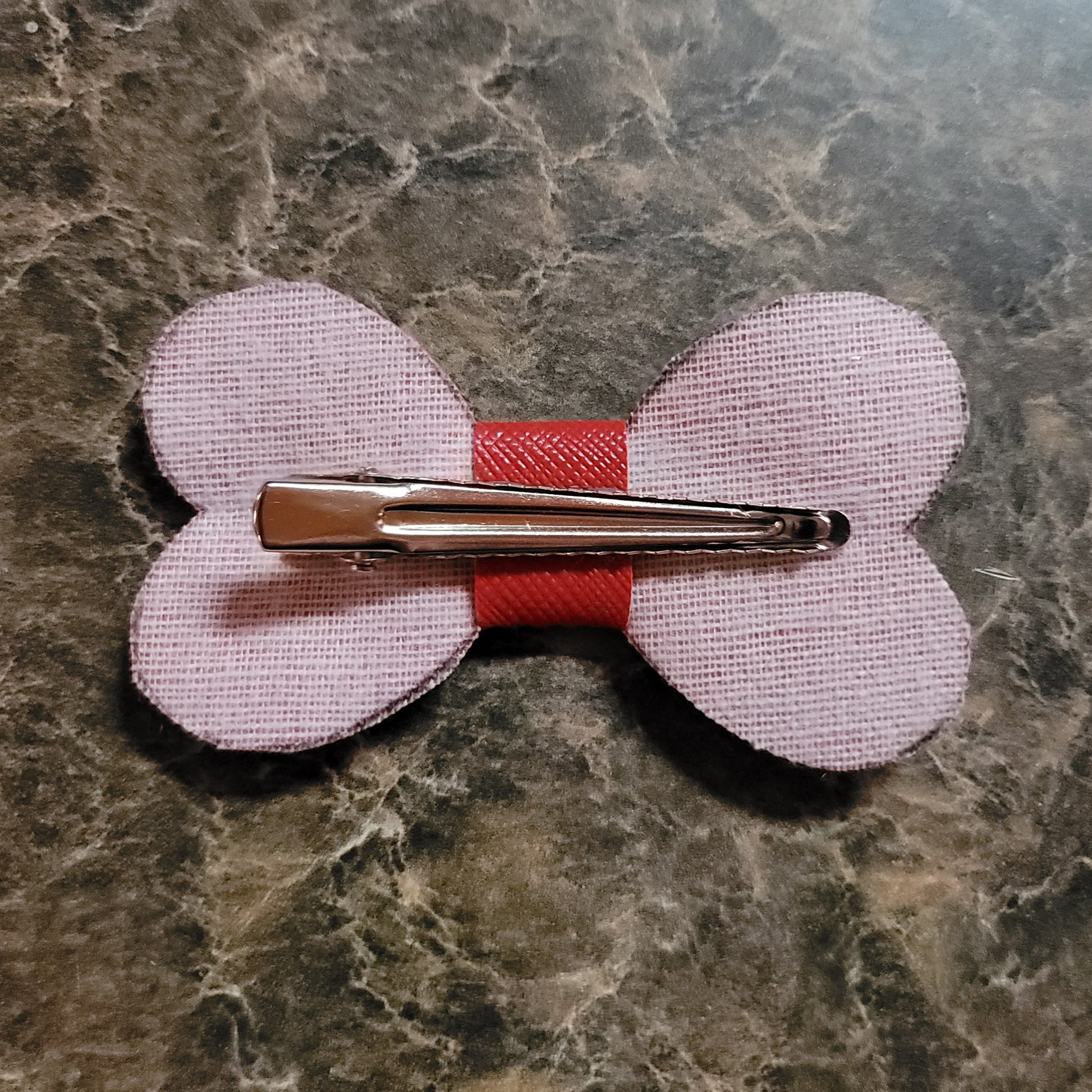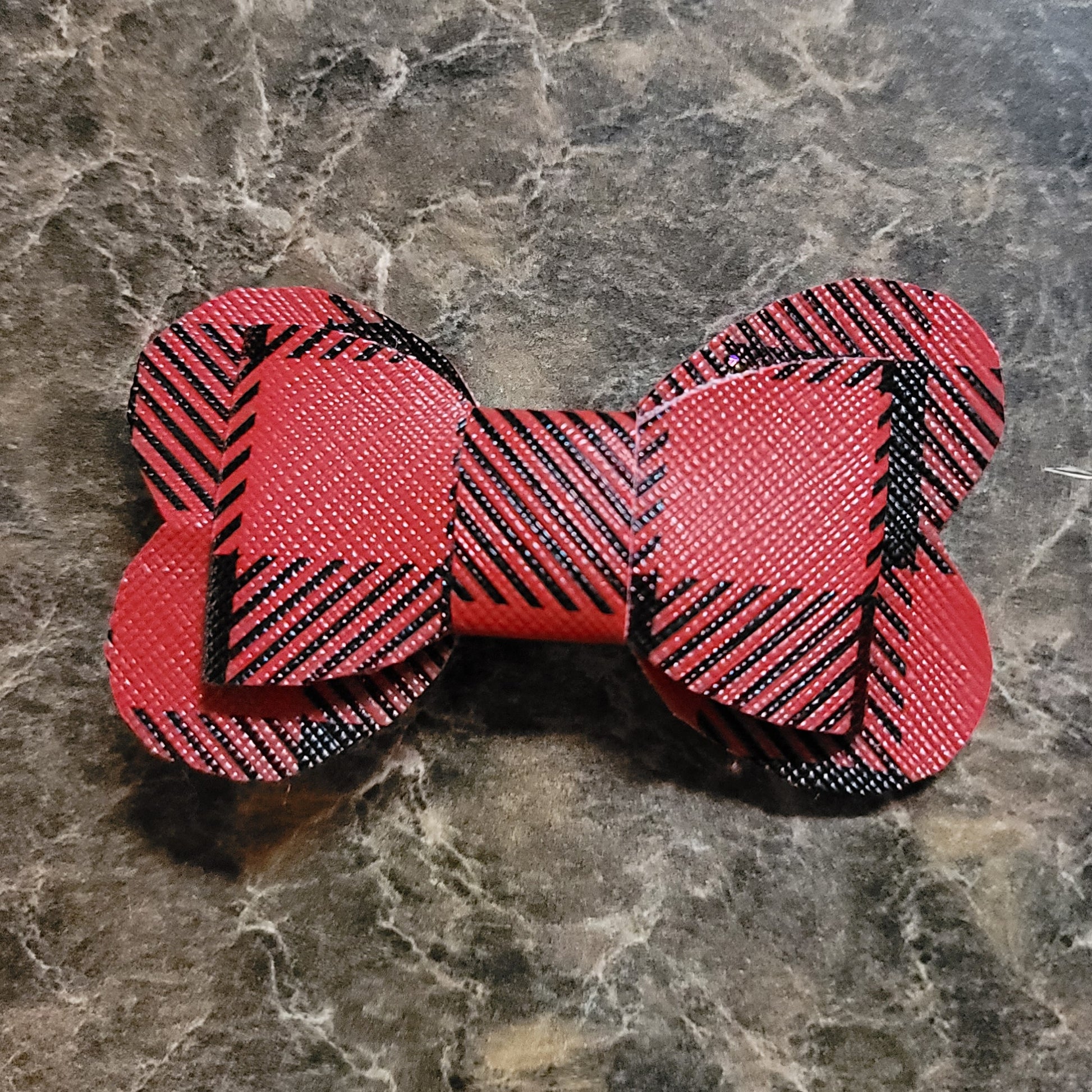 Red & black checkered faux leather. Bow secured on an alligator clip.