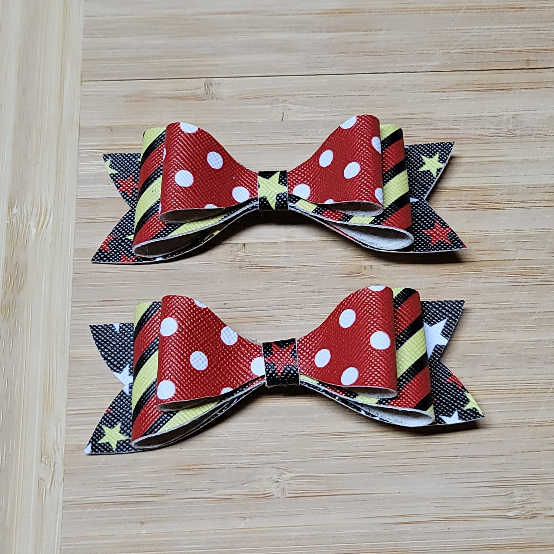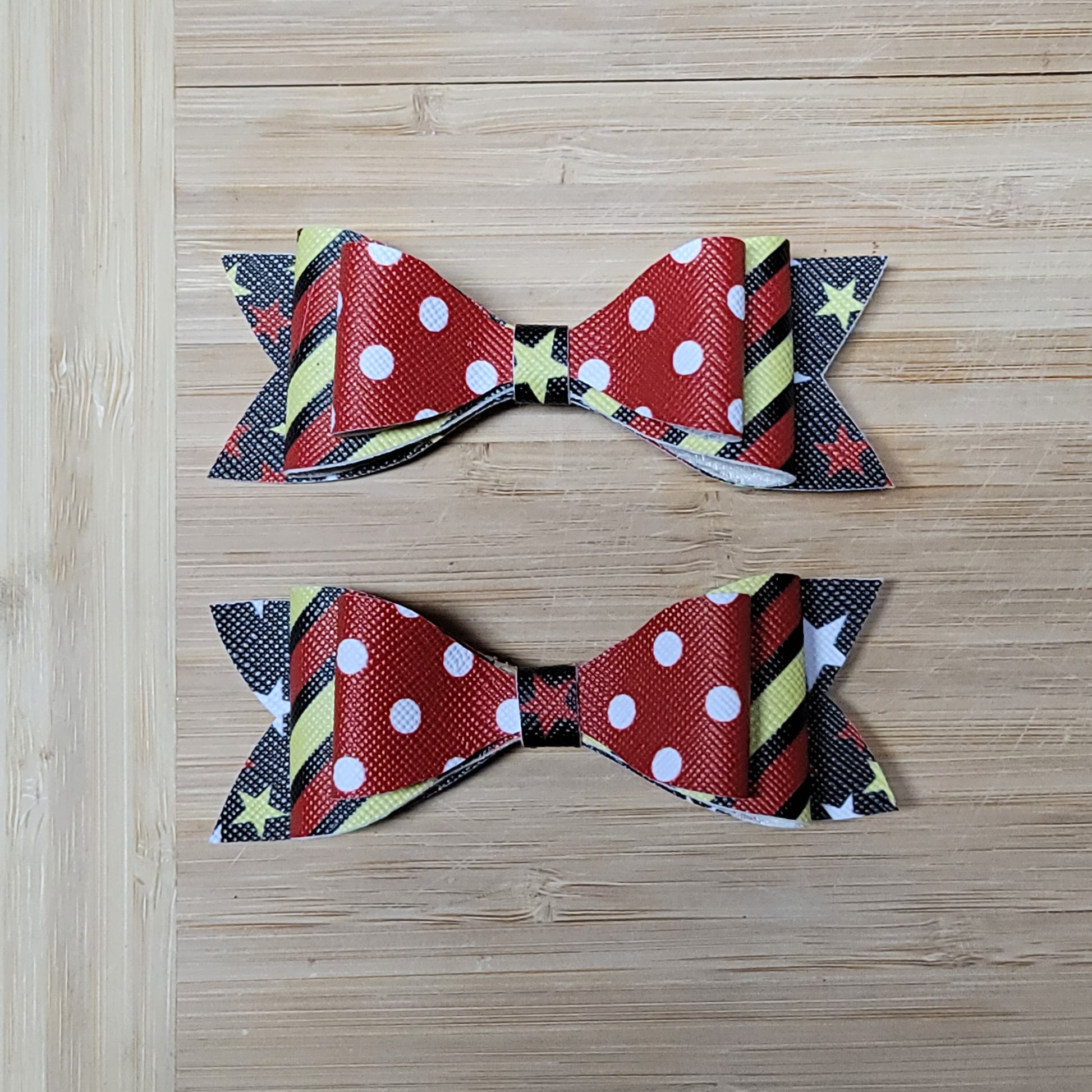 Faux leather double stack small bow set secured on alligator clips. Red and white Polka Dot; red, black and yellow stars: black, red and yellow stripes.
