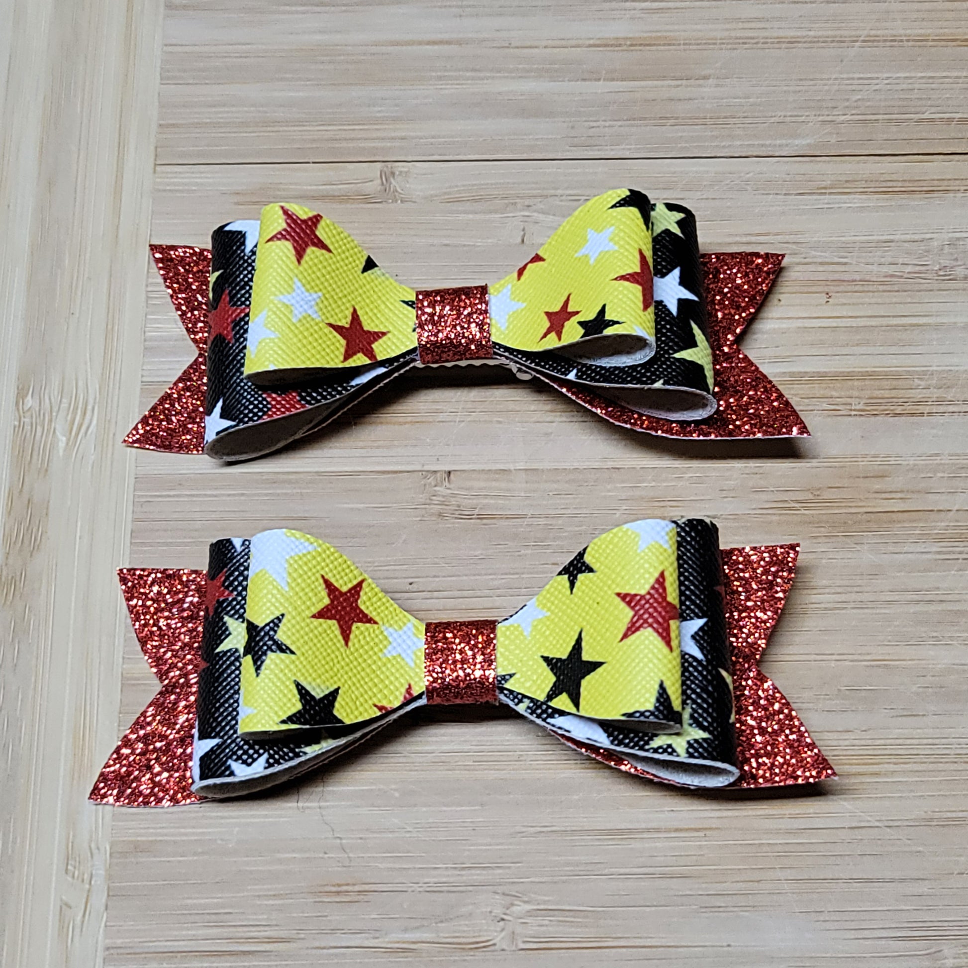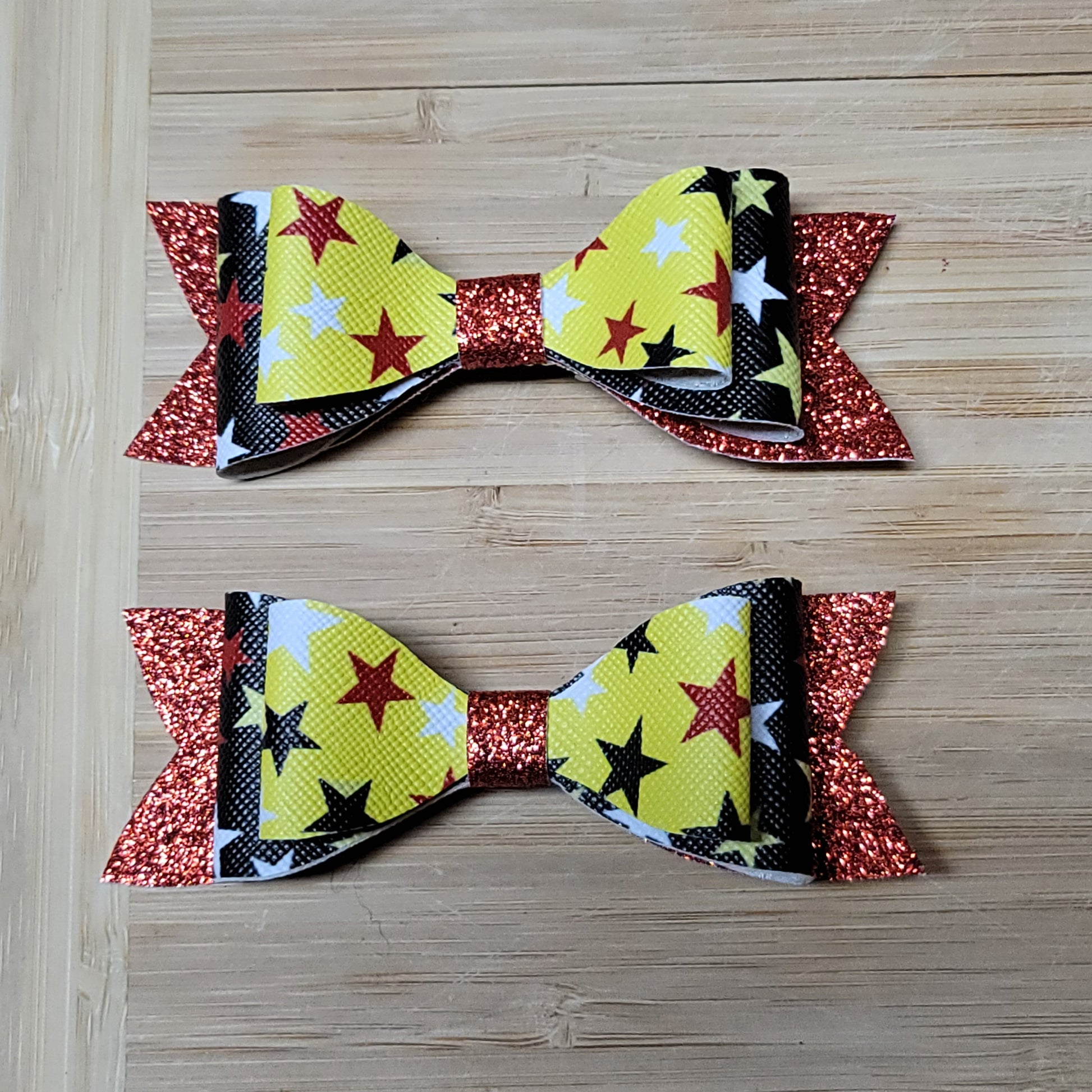 Faux leather red glitter and stars double stack small bow set secured on alligator clips.