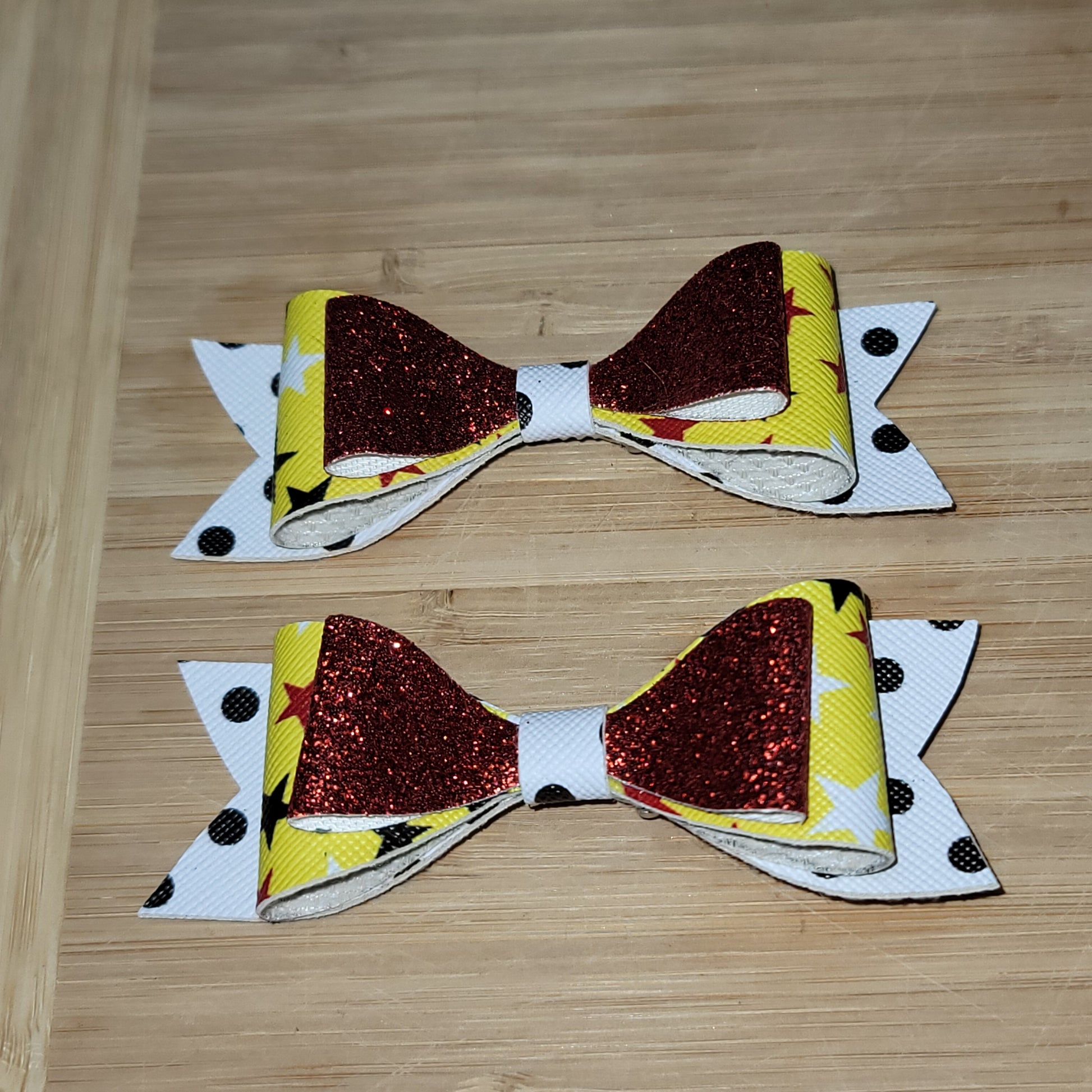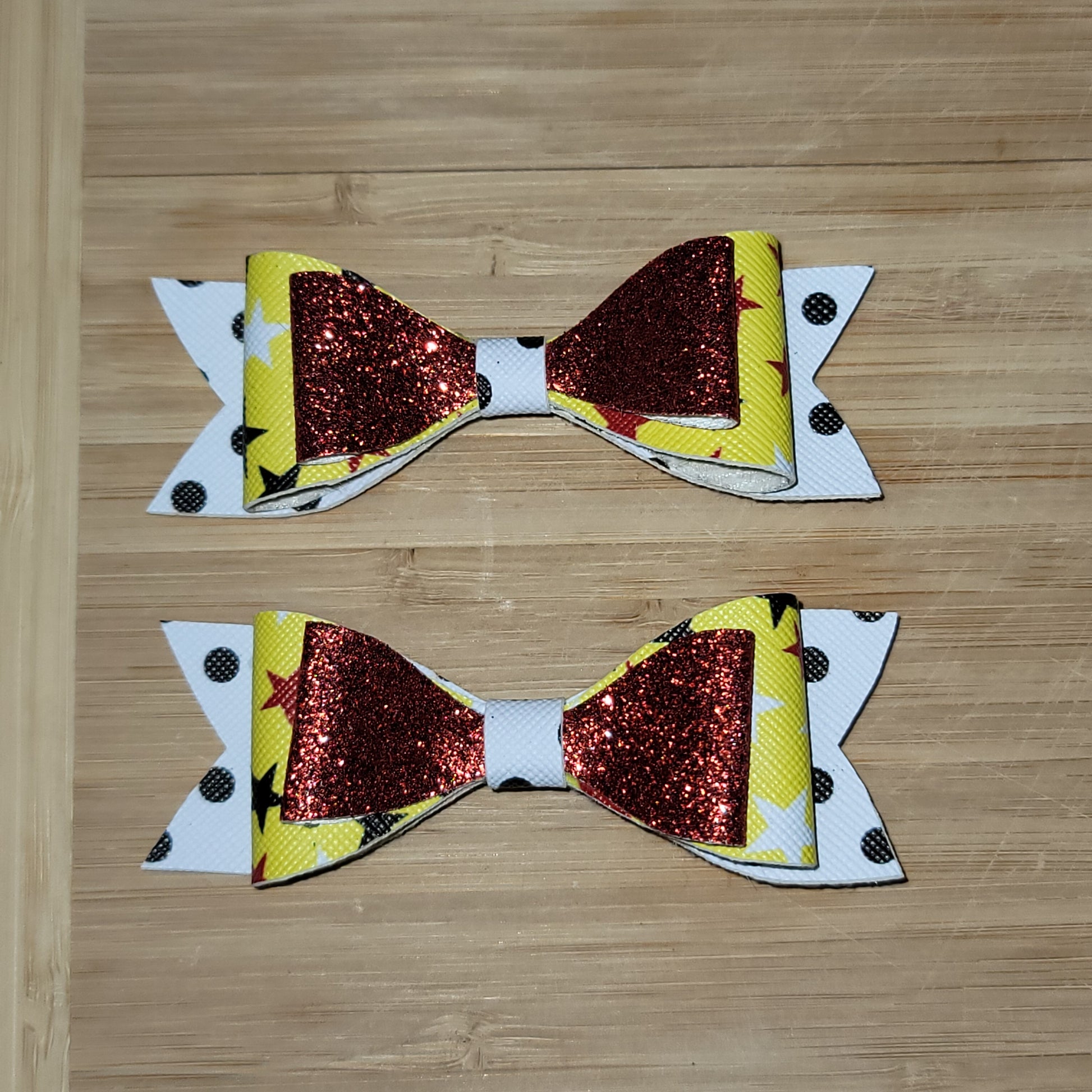 Faux leather red glitter, yellow stars and black/white Polka Dot double stack small bow set secured on alligator clips.