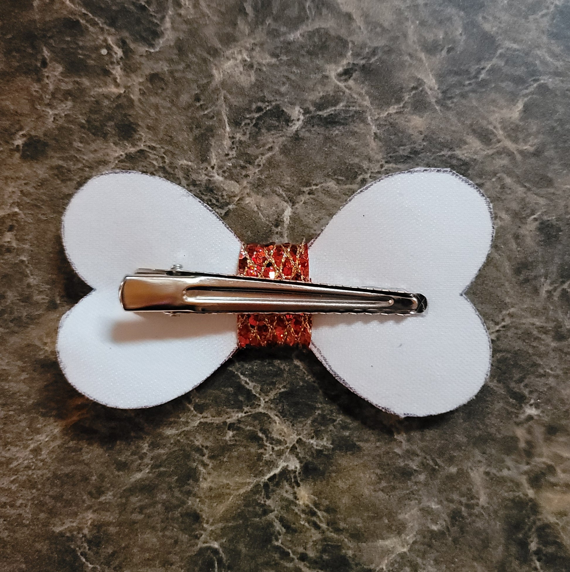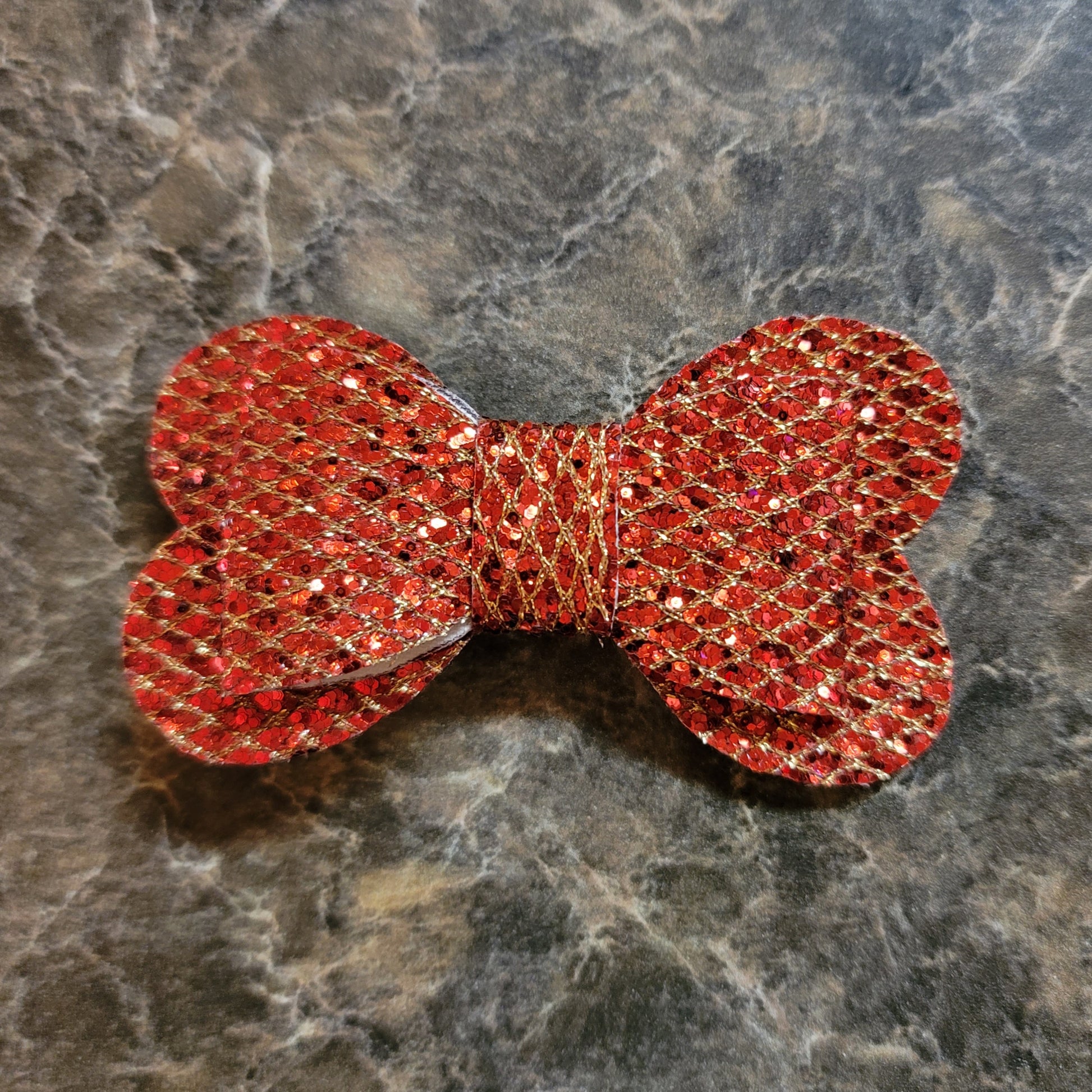 Red & Gold diamond print glitter material with soft backing. Bow secured on an alligator clip.