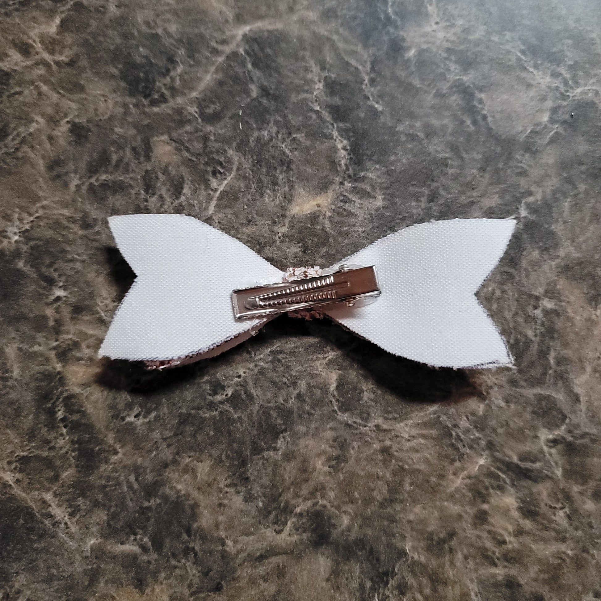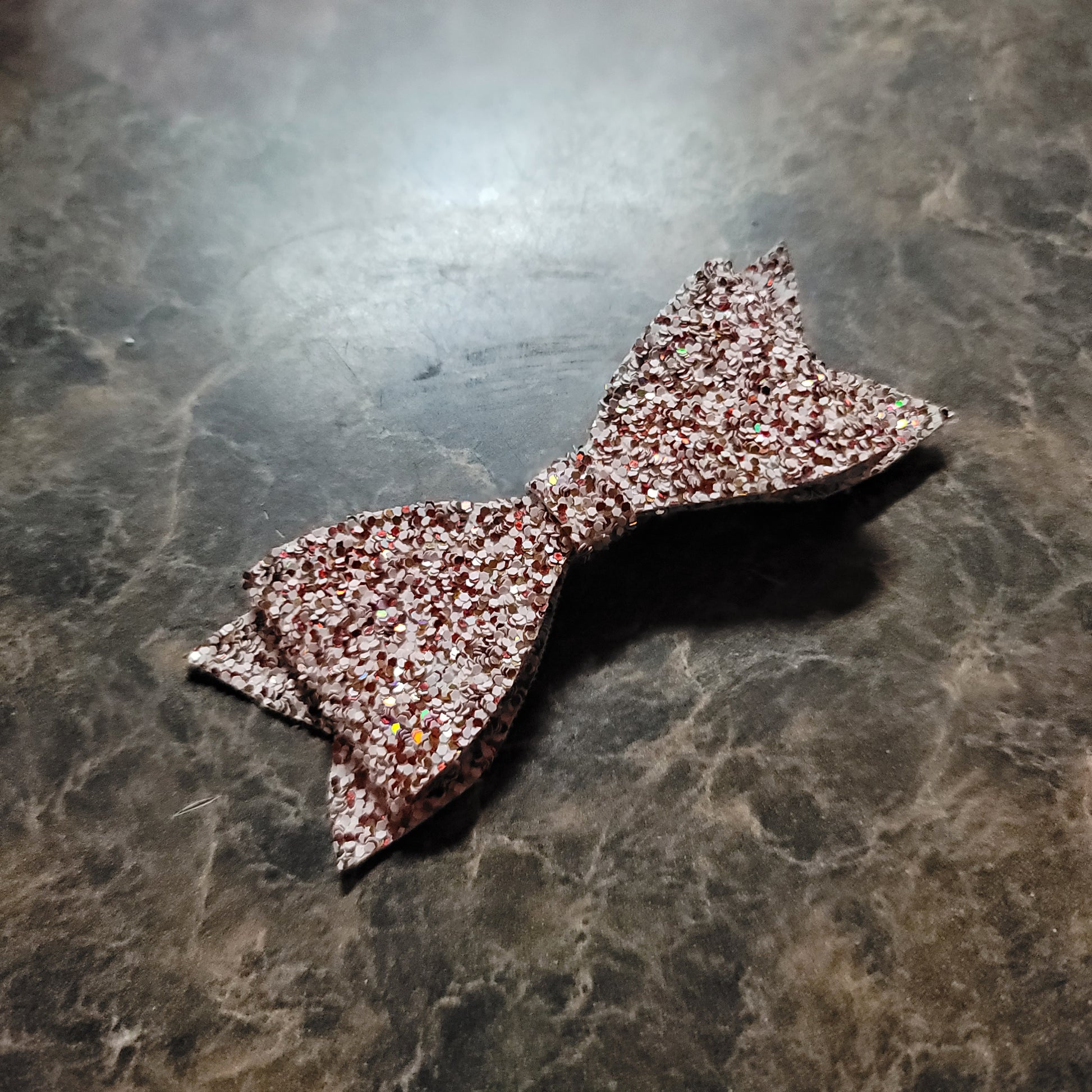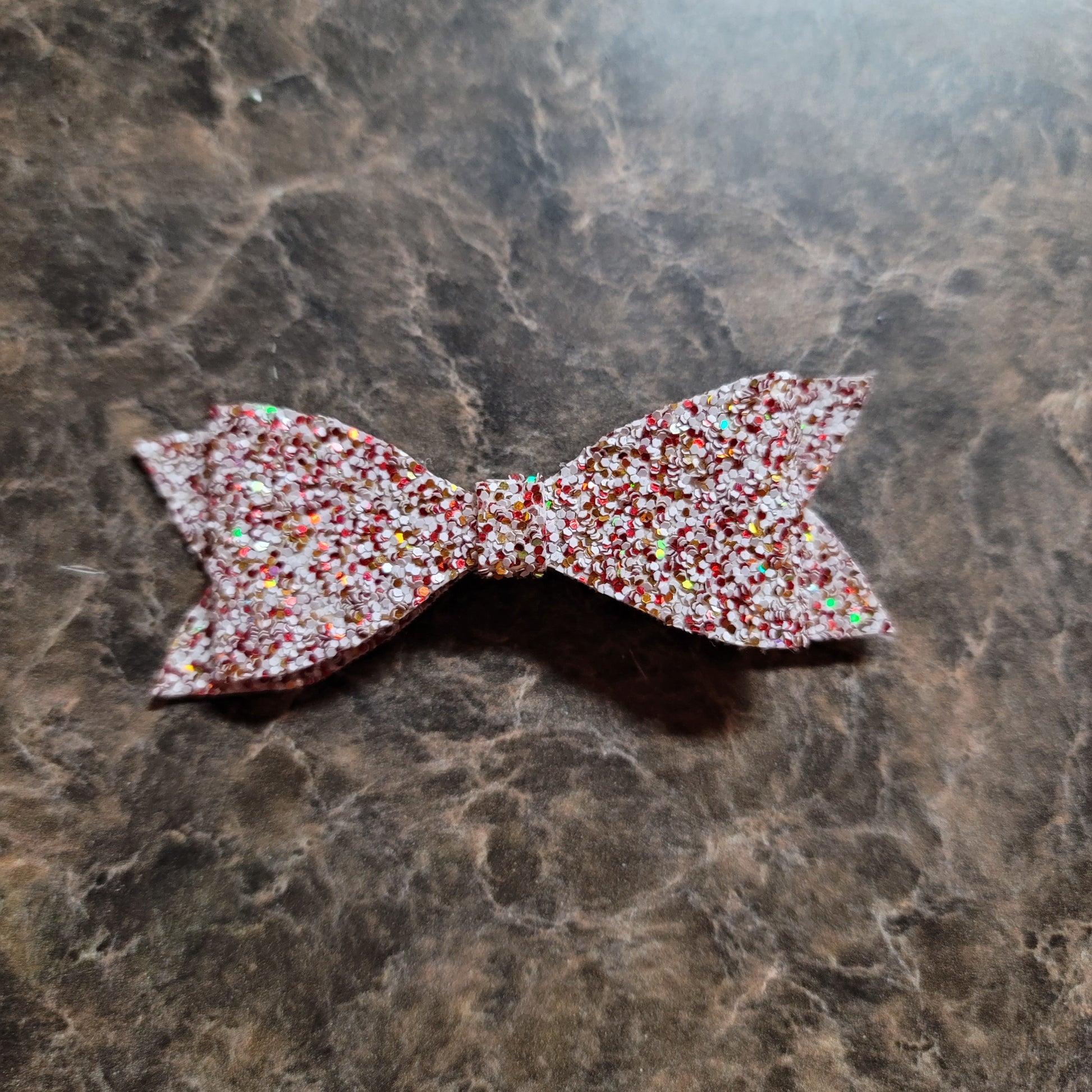 Red and green glitter material with soft backing. Small bow secured on an alligator clip.