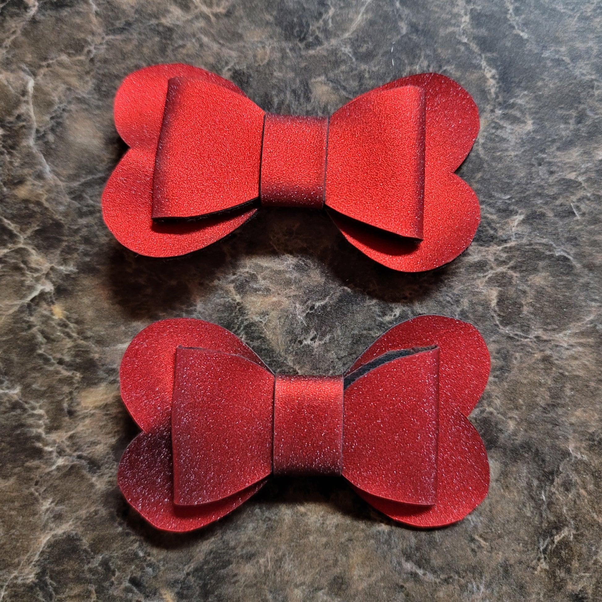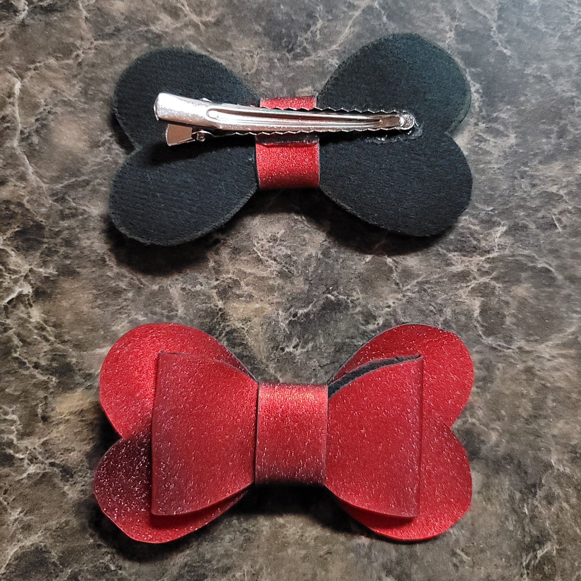Red metallic faux leather. Bow secured on an alligator clip.