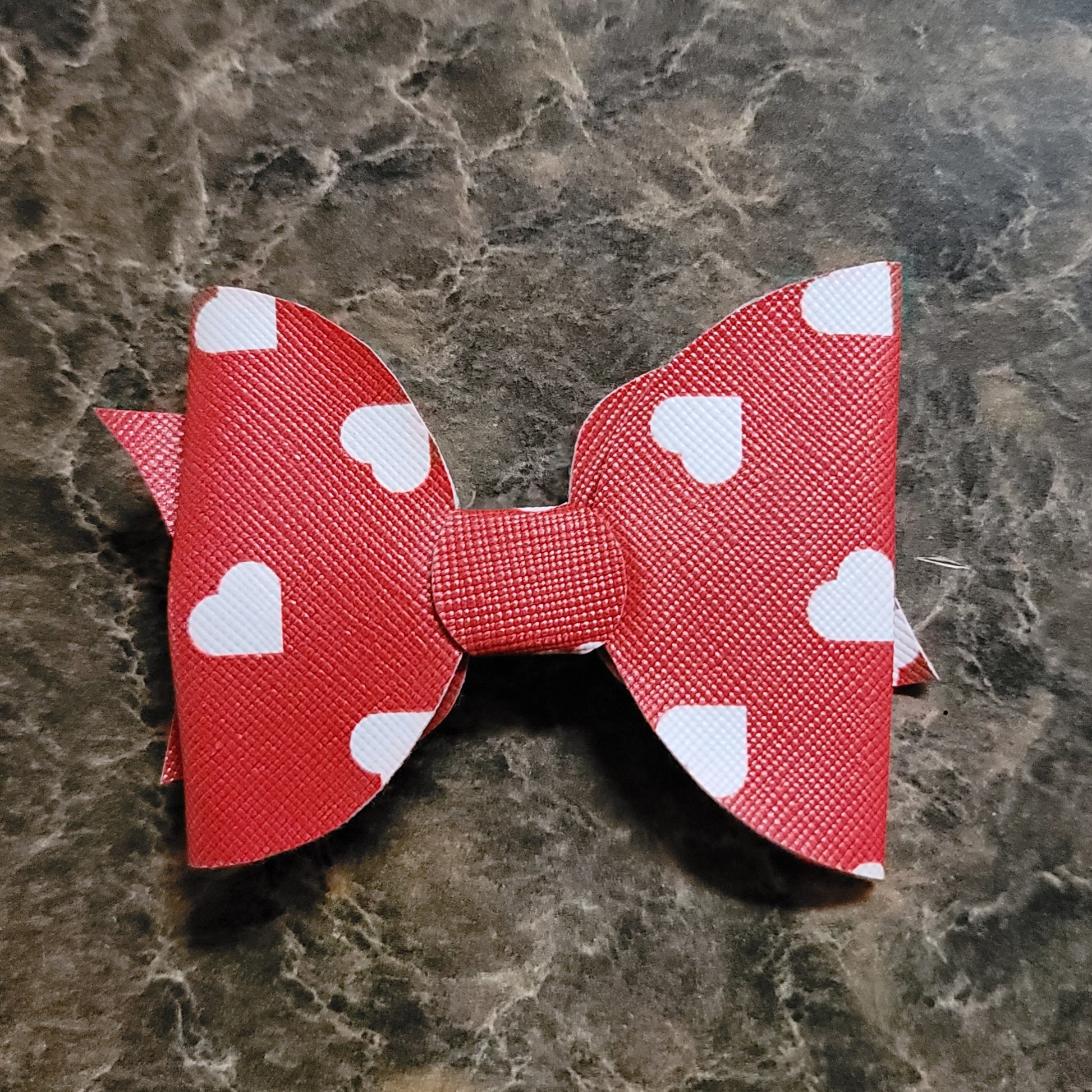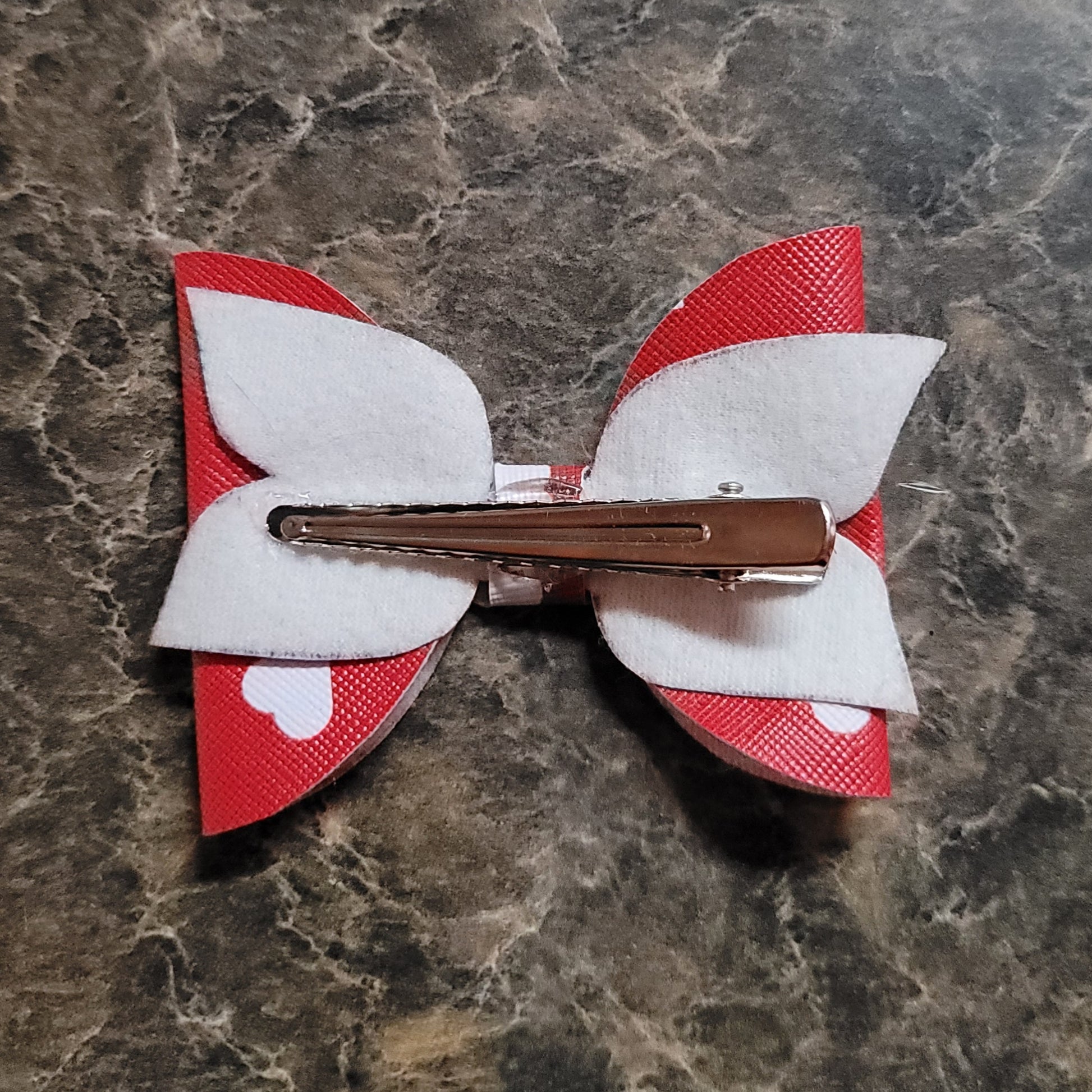Red and white heart print faux leather. Medium bow secured on an alligator clip.