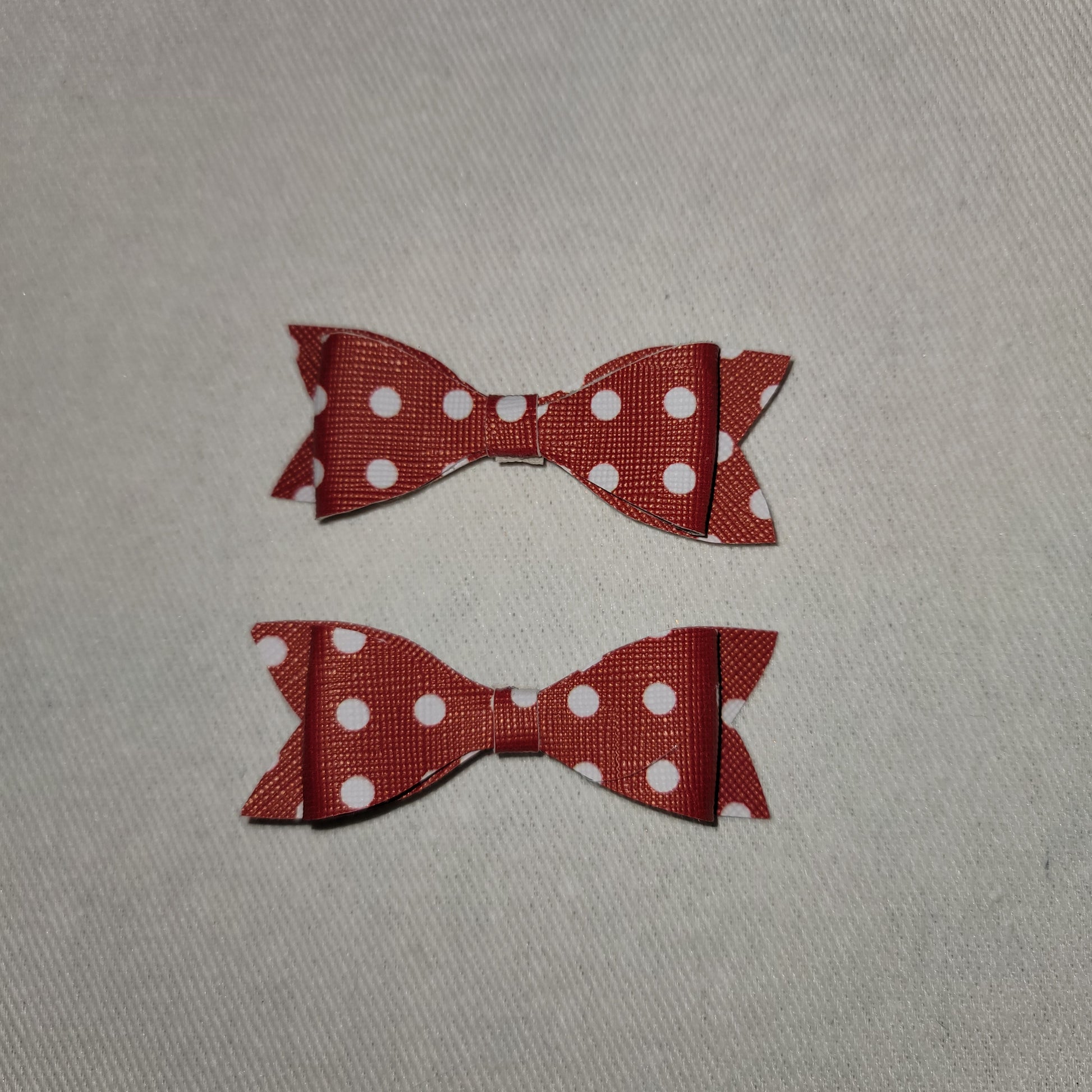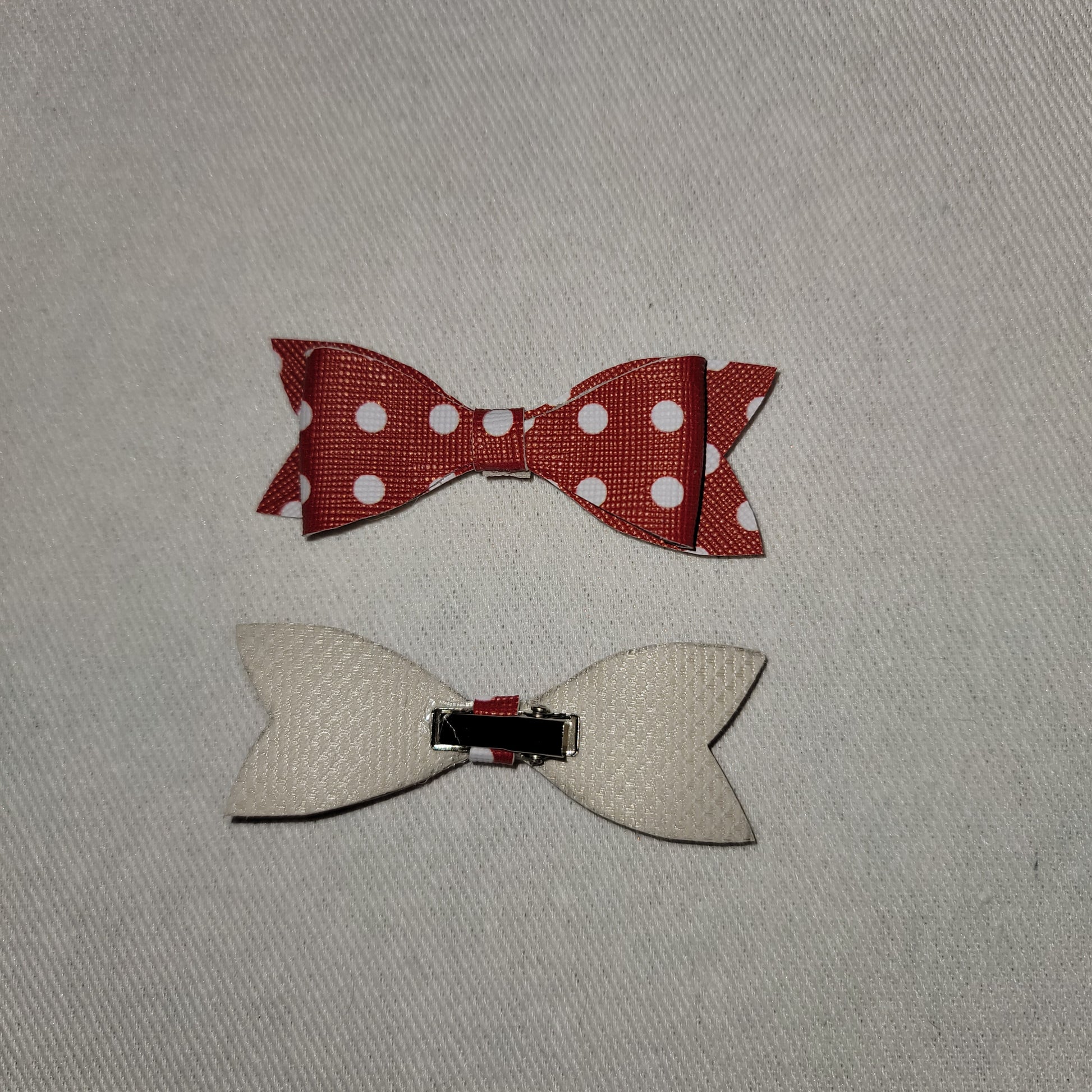 Red and white polka dot print faux leather. Mini bows secured on alligator clips.