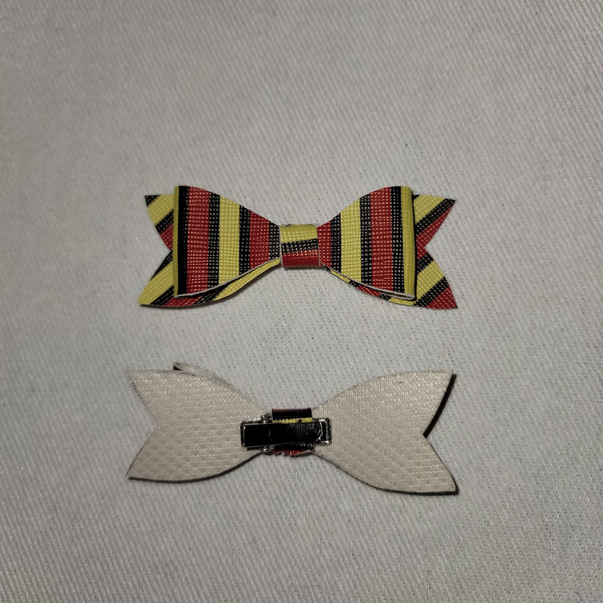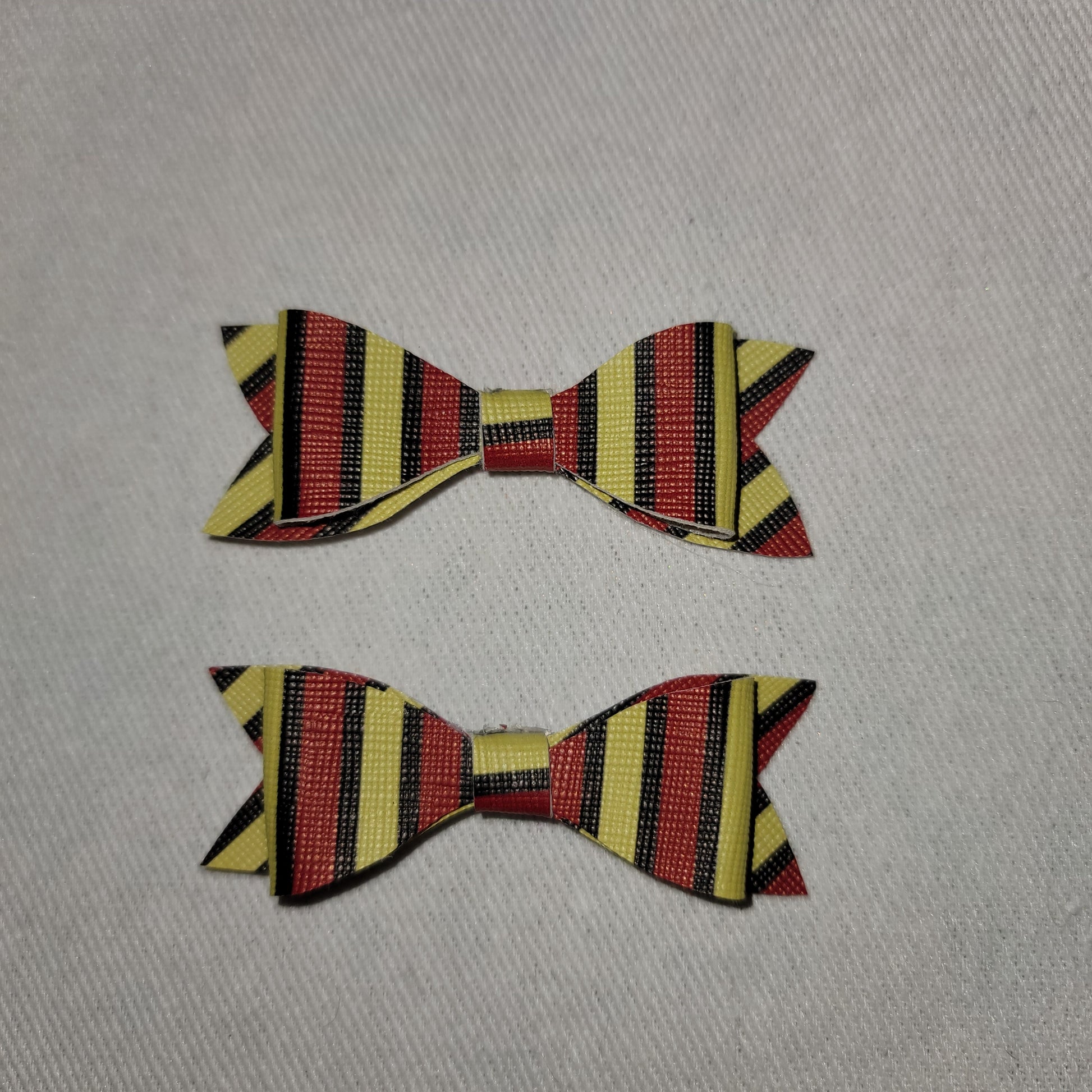 Red, yellow and black stripe faux leather. Mini bows secured on alligator clips.