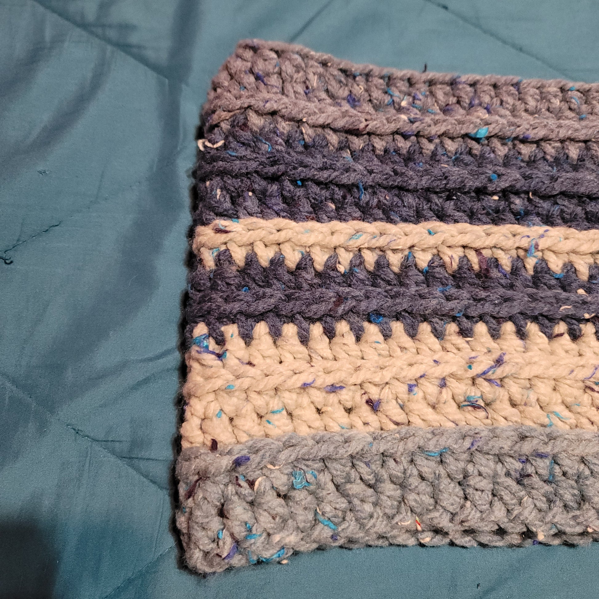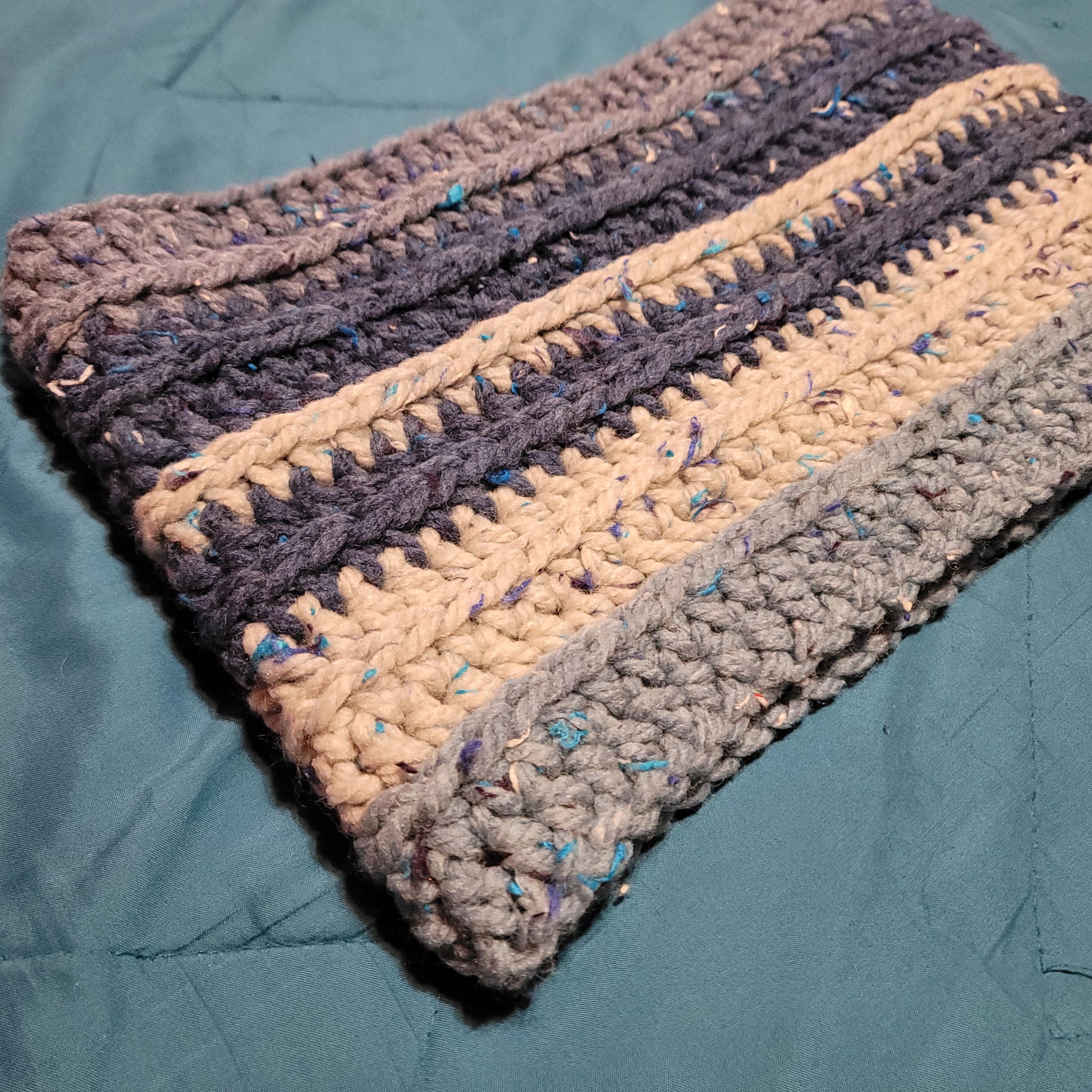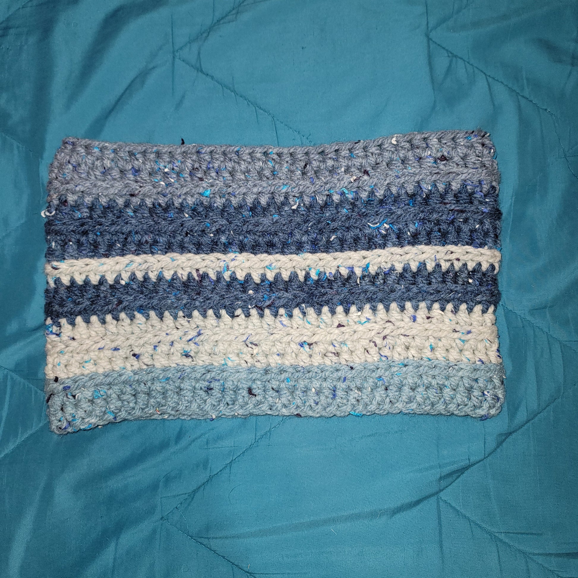 Blue and gray tones. Cowl measures 15 inches laying flat and is 9 inches tall.