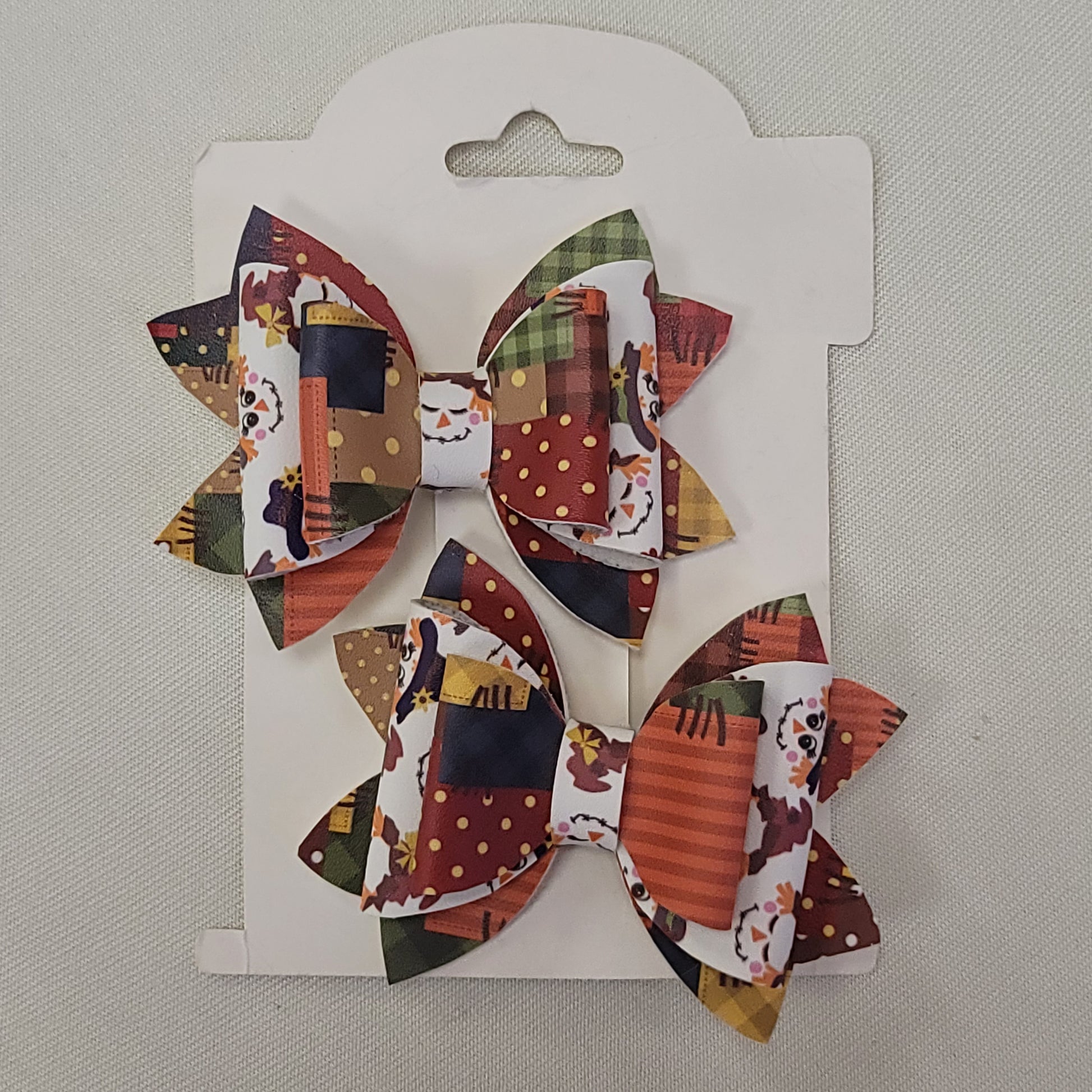 Soft scarecrow and patchwork print faux leather materials. 2.5 inch Lou Lou bows secured on alligator clips.