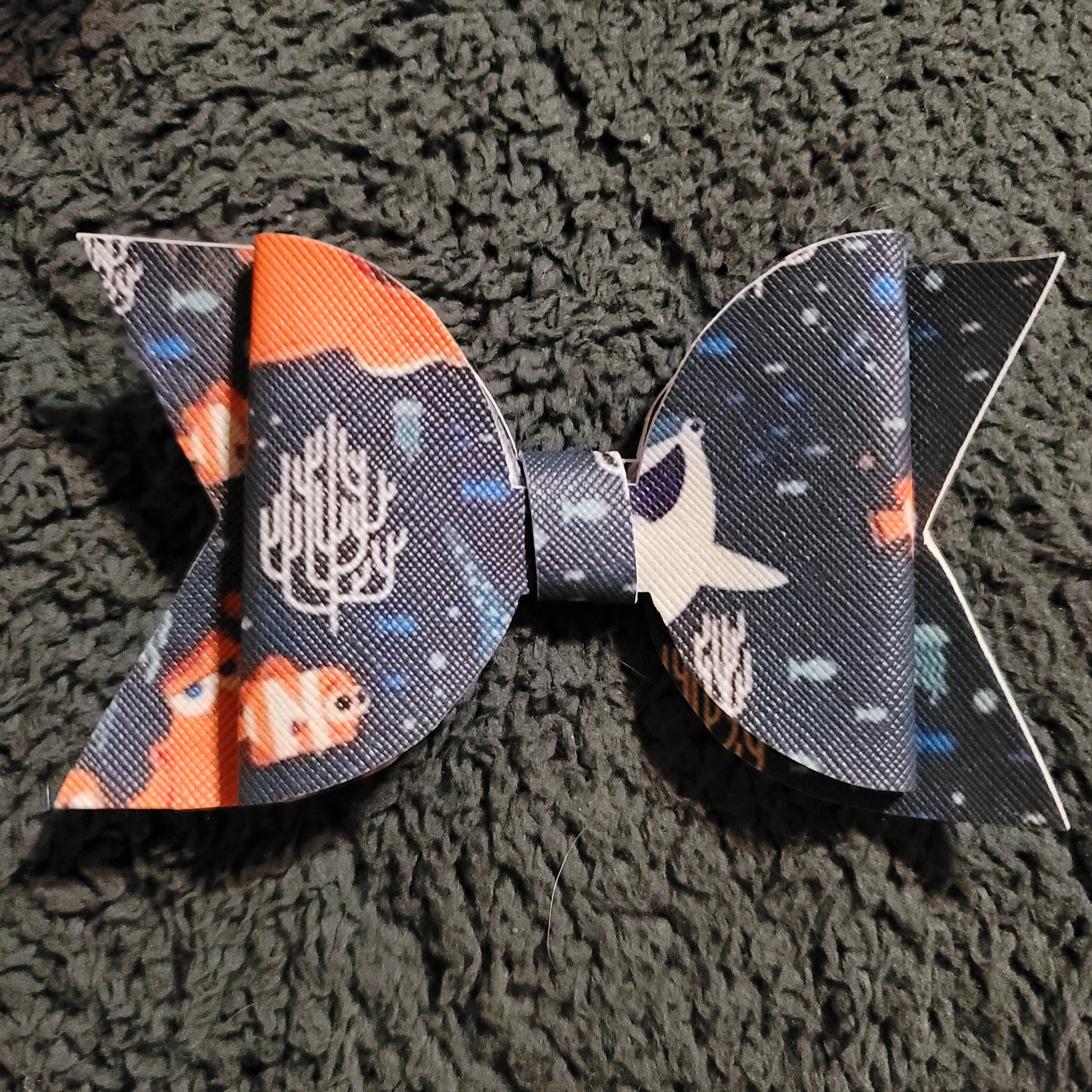 Finding Nemo print faux vegan leather bow secured to an alligator clip.