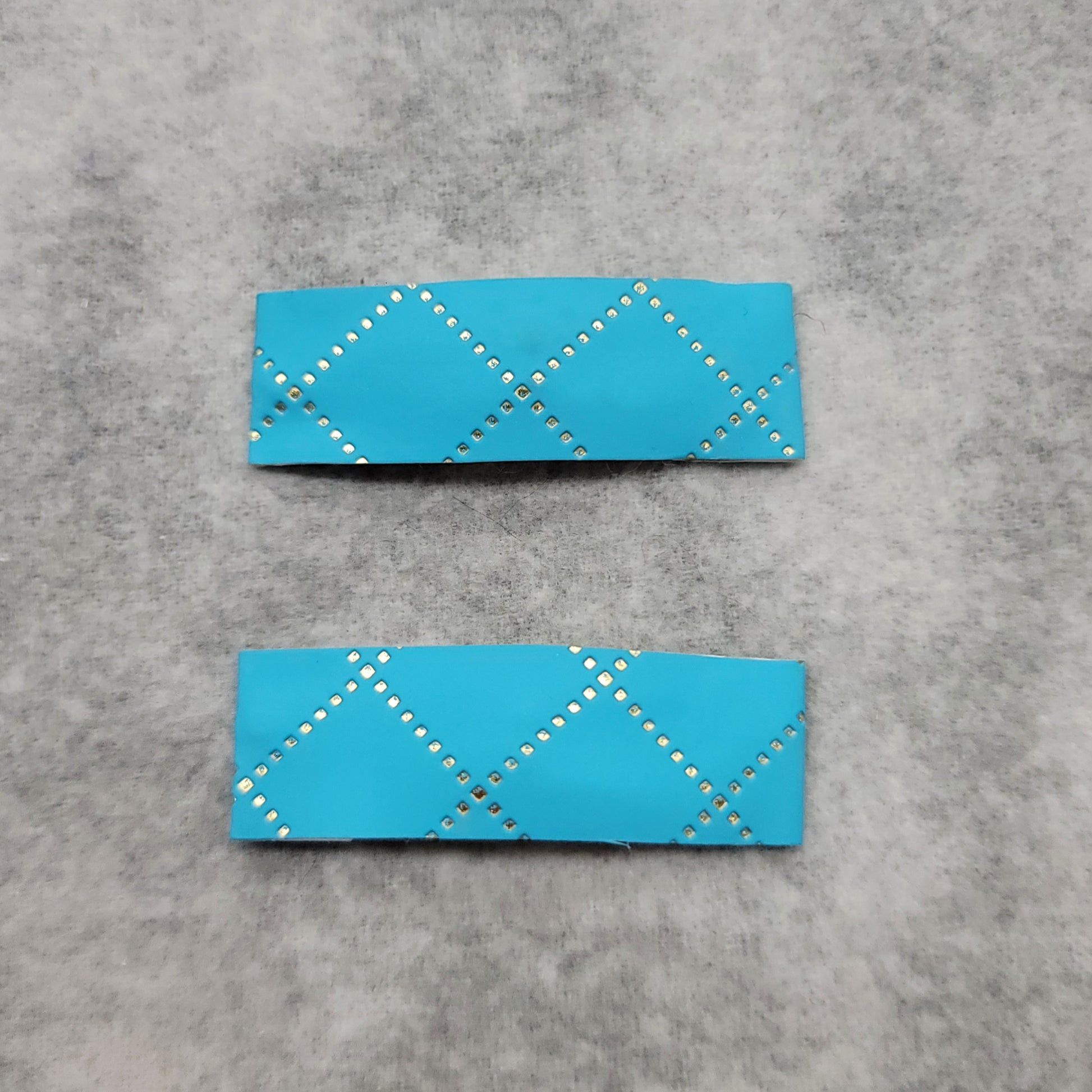 Sky blue with gold diamond print secured on a 2 inch snap clip.