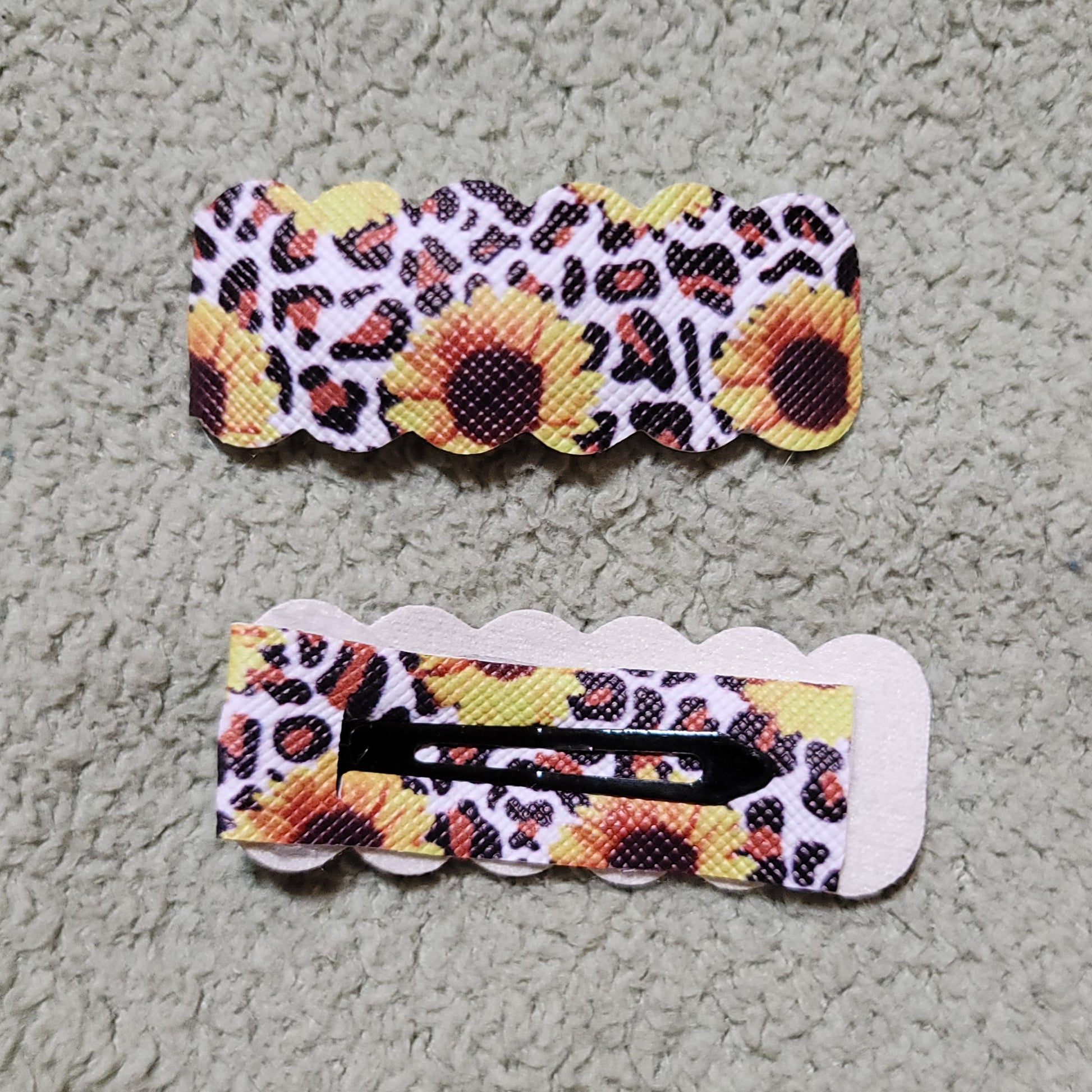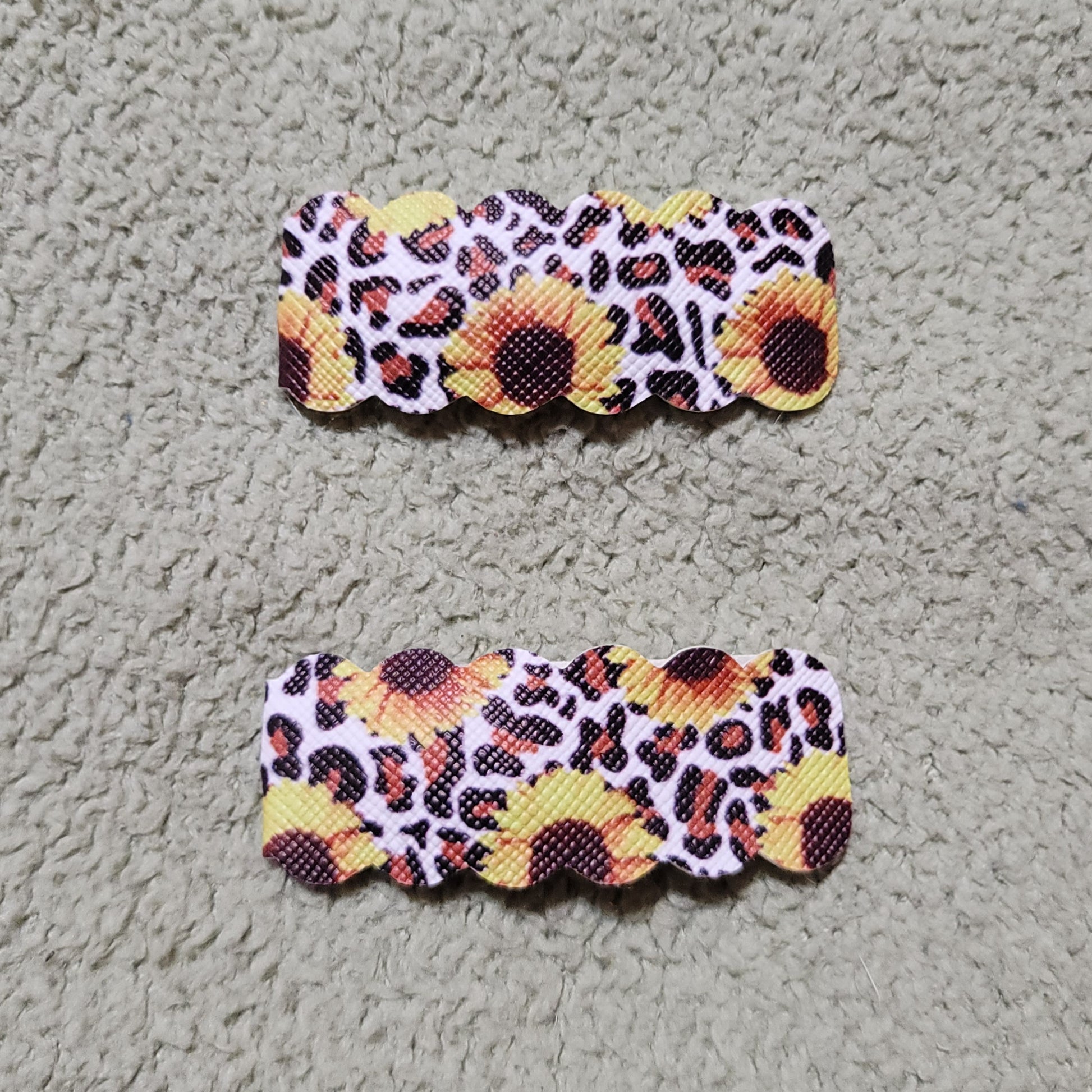 Sunflower & cheetah print faux leather. Secured on 2 inch snap clips.