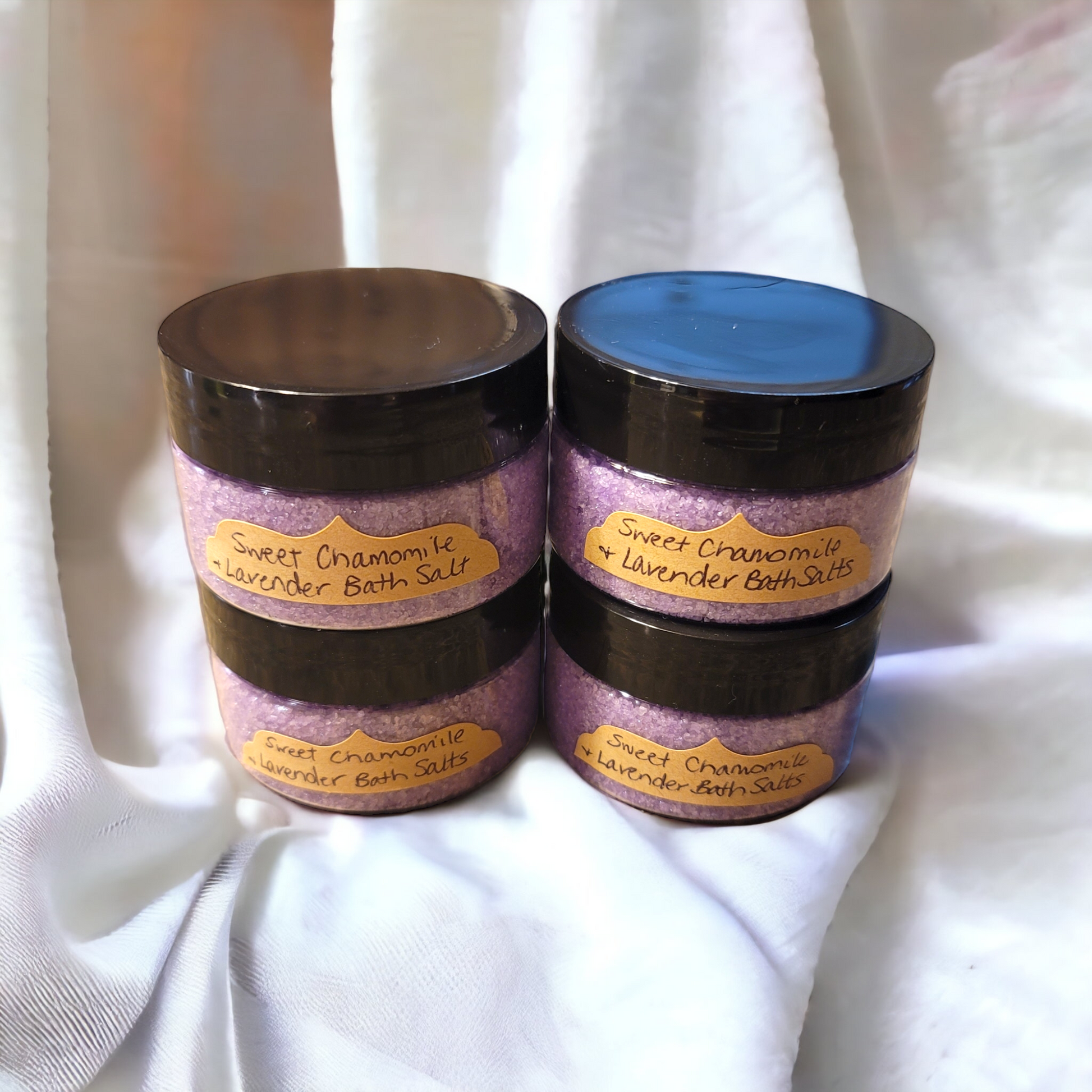 Ingredients: organic Epsom salt, organic baking soda, essentials oils, Chamomile extract, Vitamin E oil, and mica powder for color.