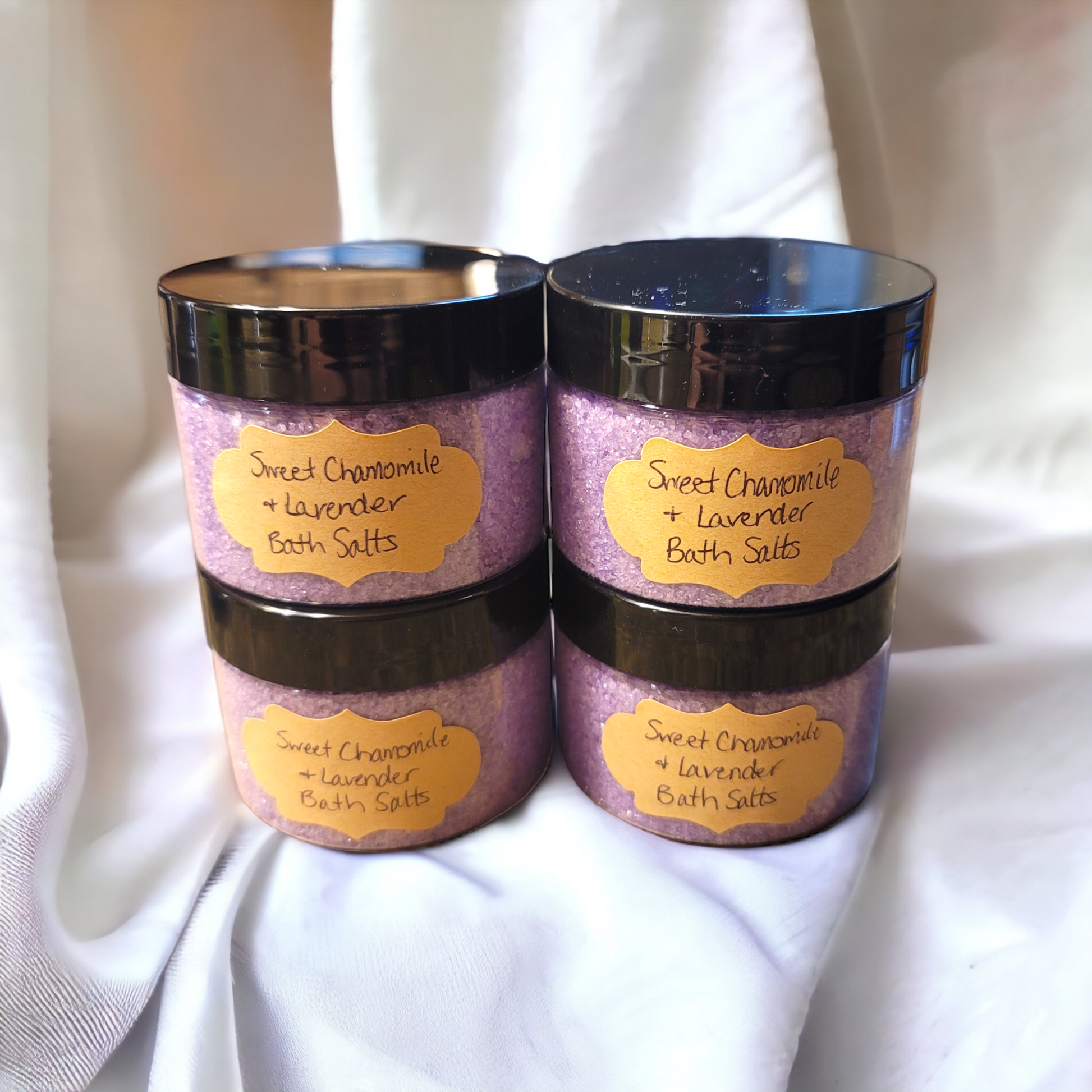 Ingredients: organic Epsom salt, organic baking soda, essentials oils, Chamomile extract, Vitamin E oil, and mica powder for color.