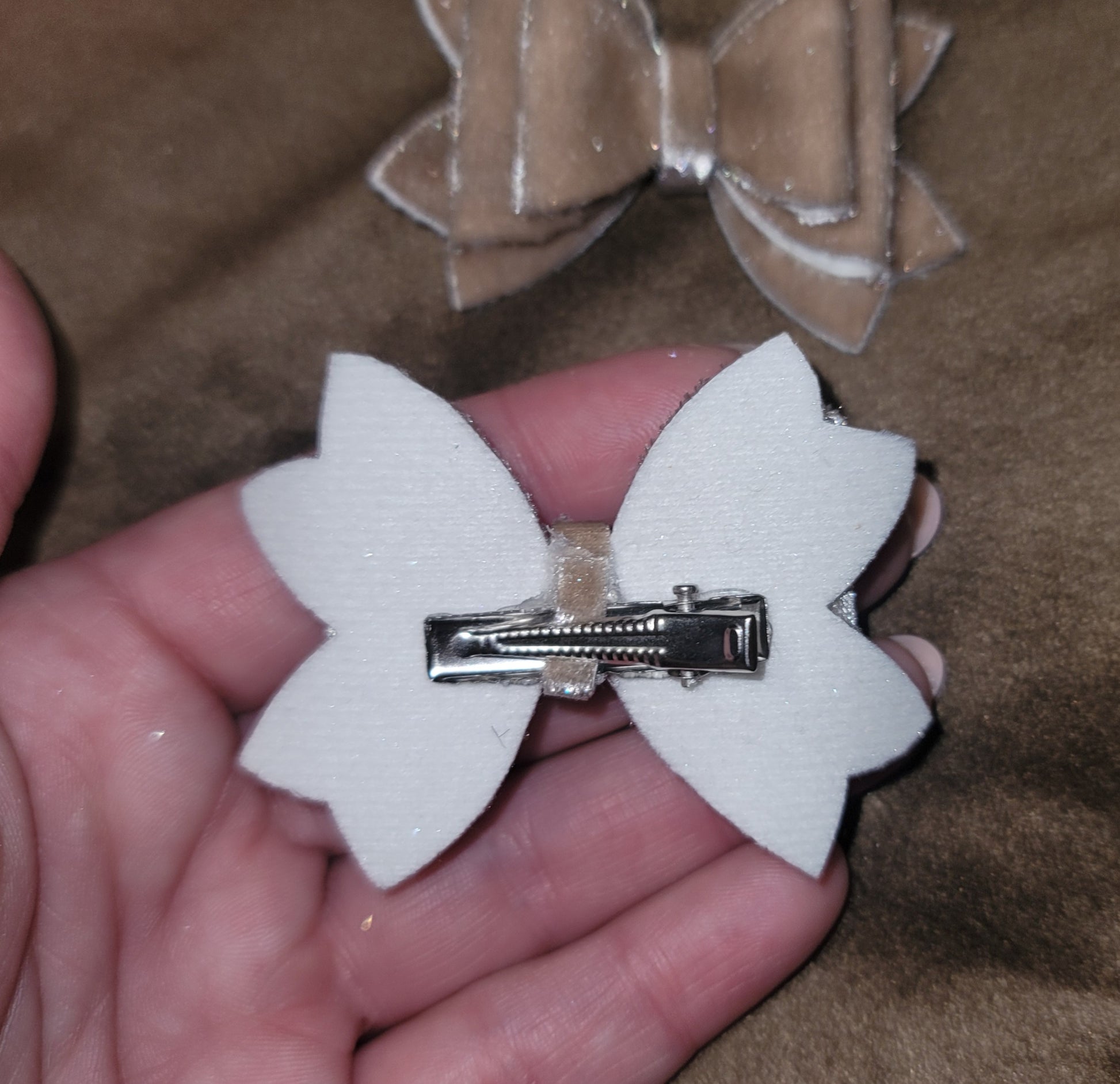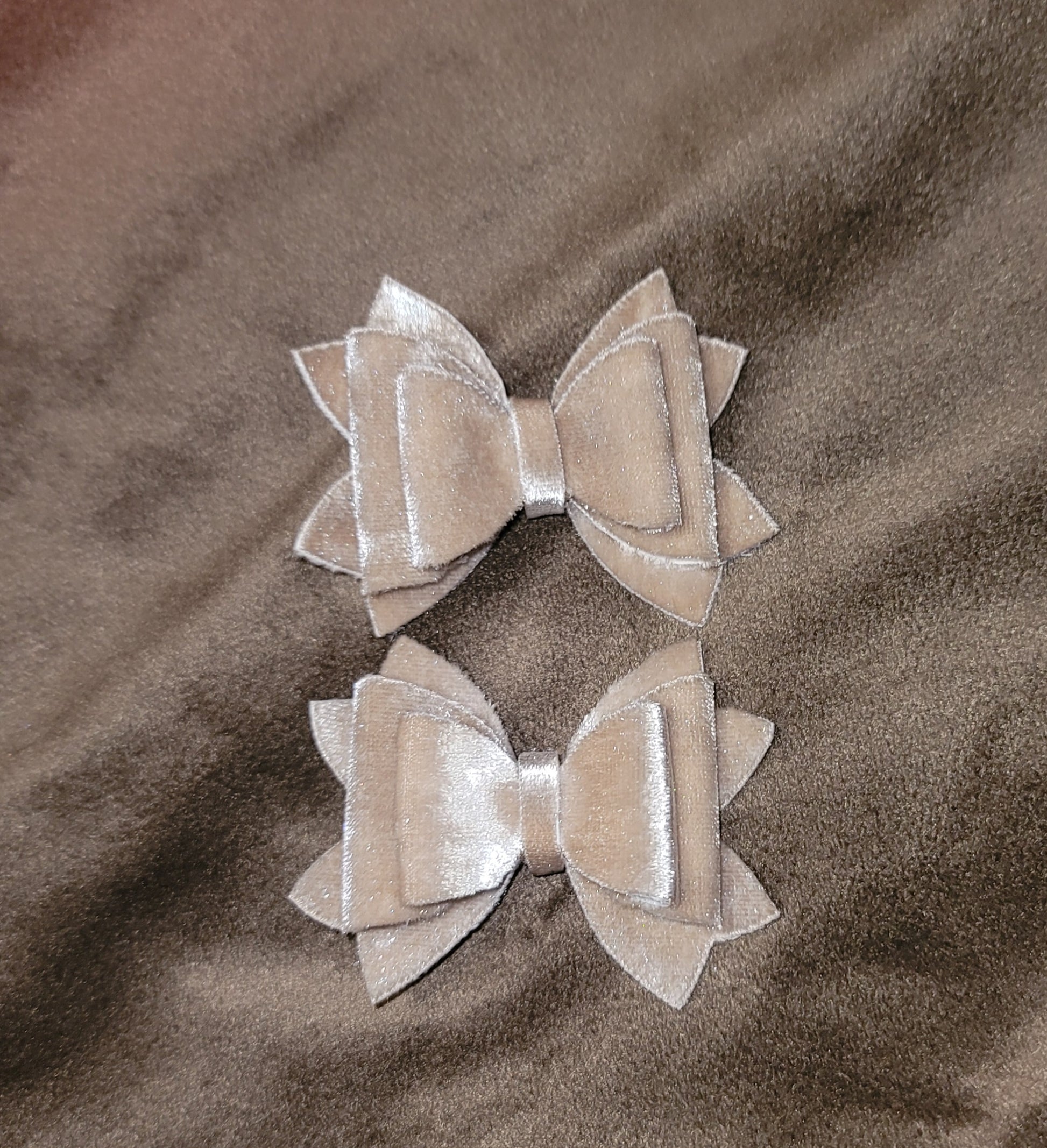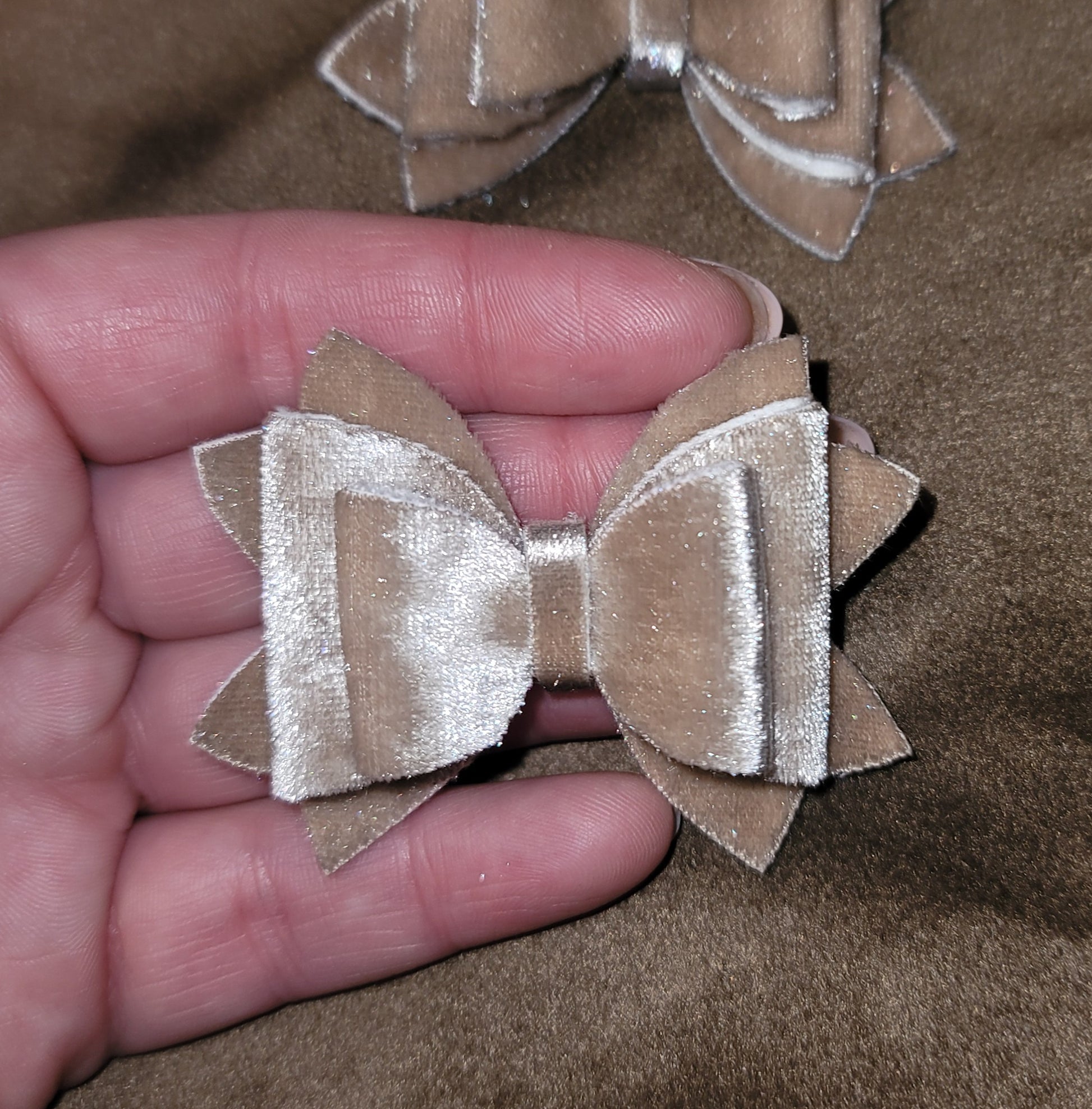 Tan velvet material. 2.5 inch Lou Lou style bow set. Secured on alligator clips.