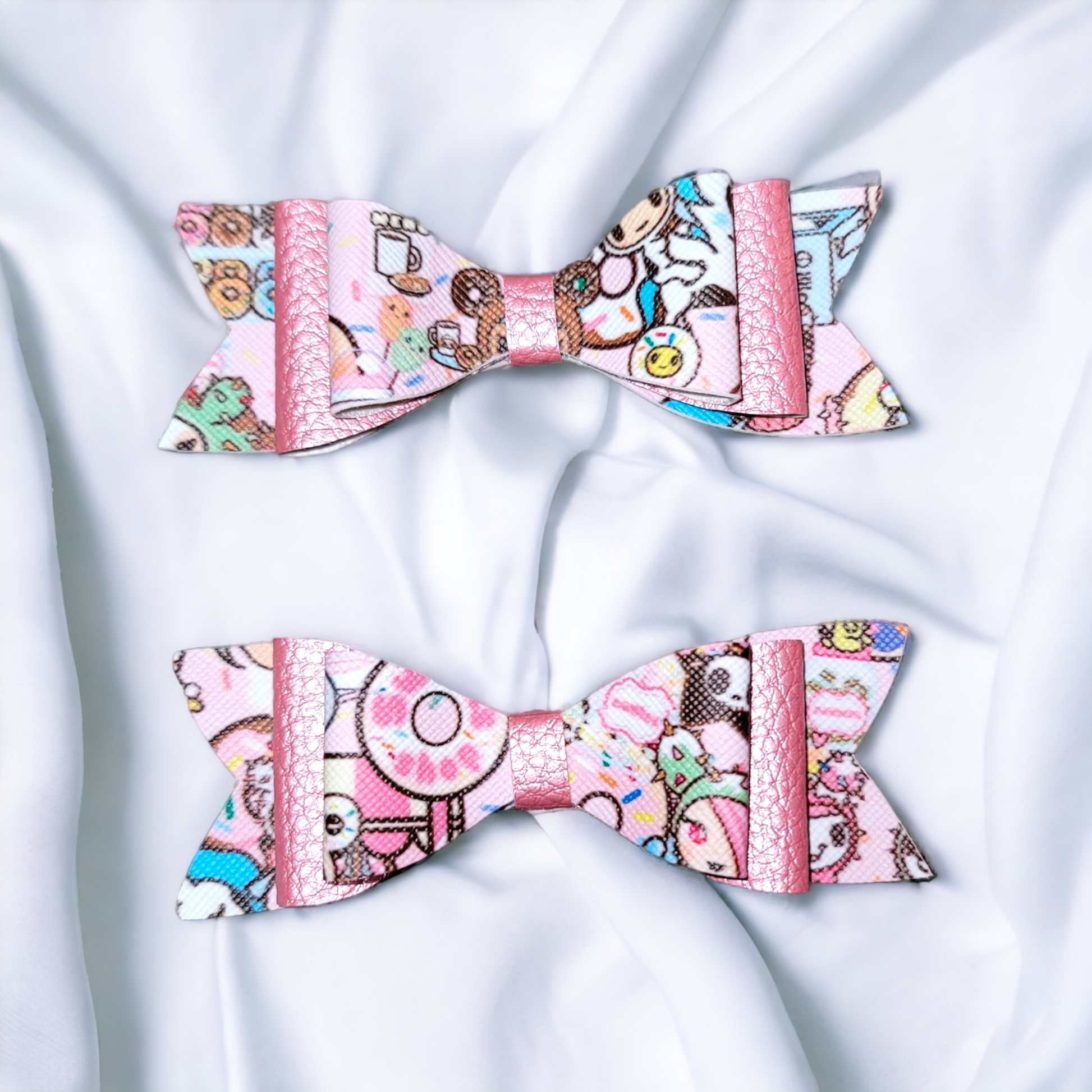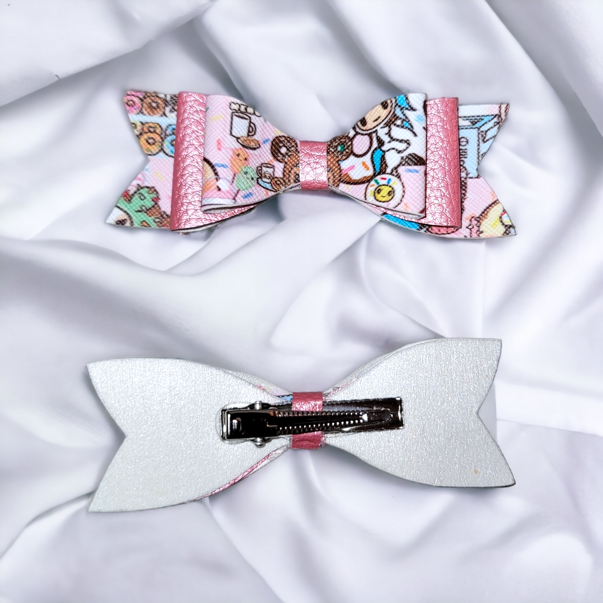 Toki Doki print faux leather & pearlescent pink faux leather. Double stack small bows secured on alligator clips.
