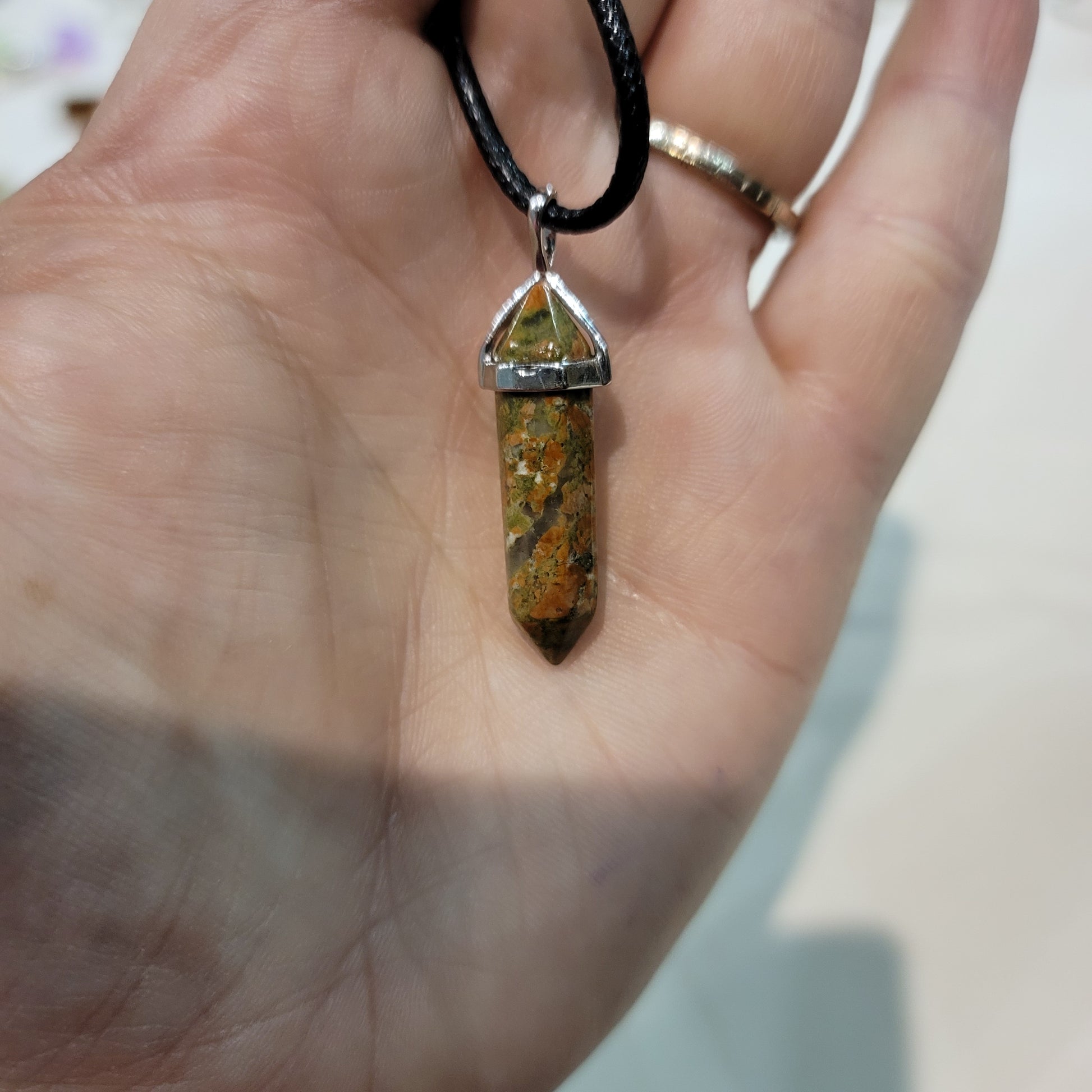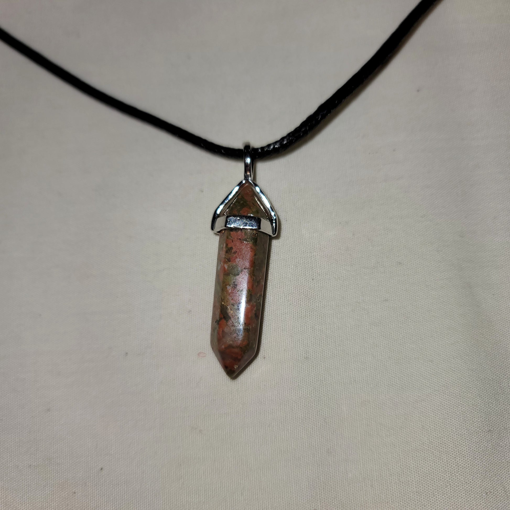 Unakite pendant on a cord necklace.