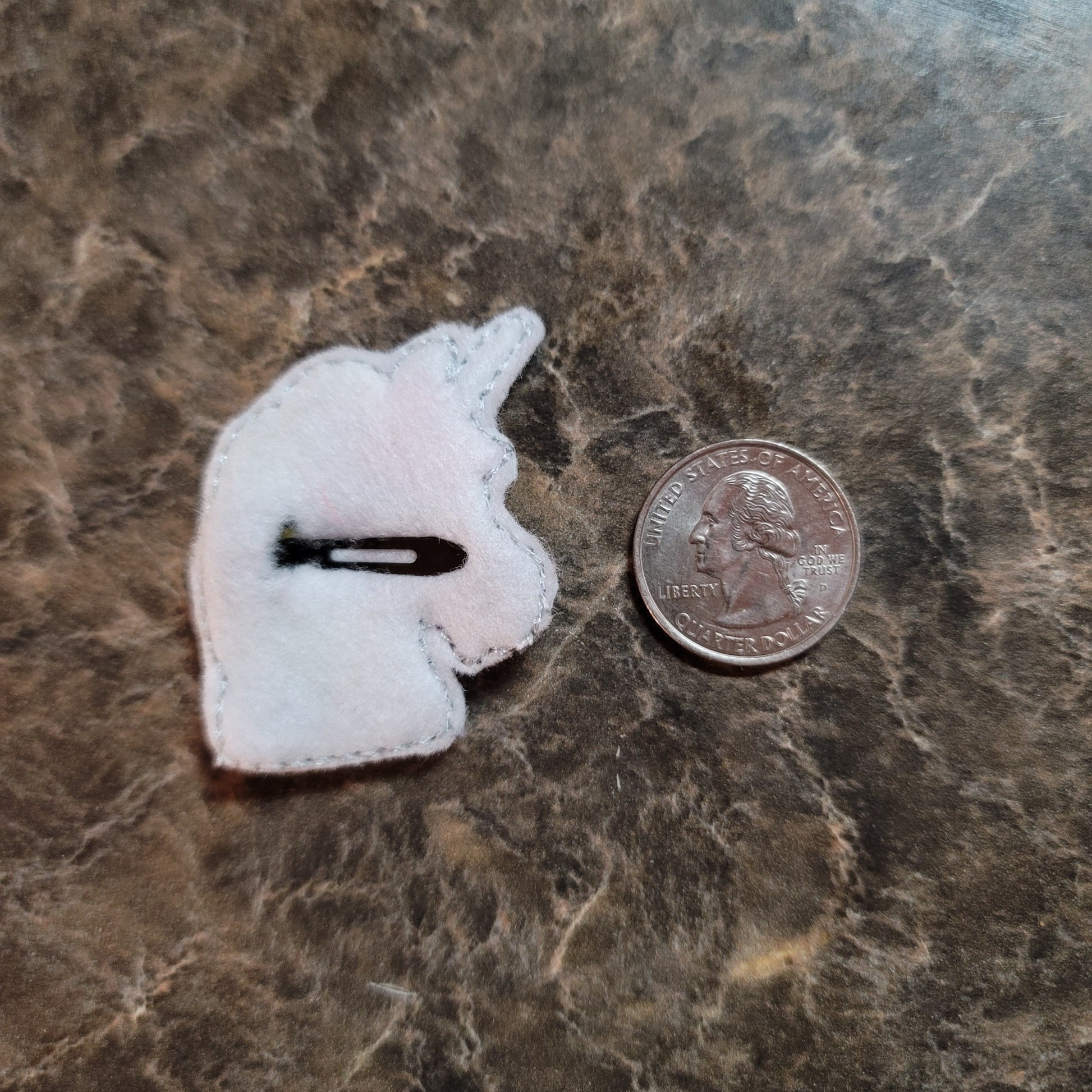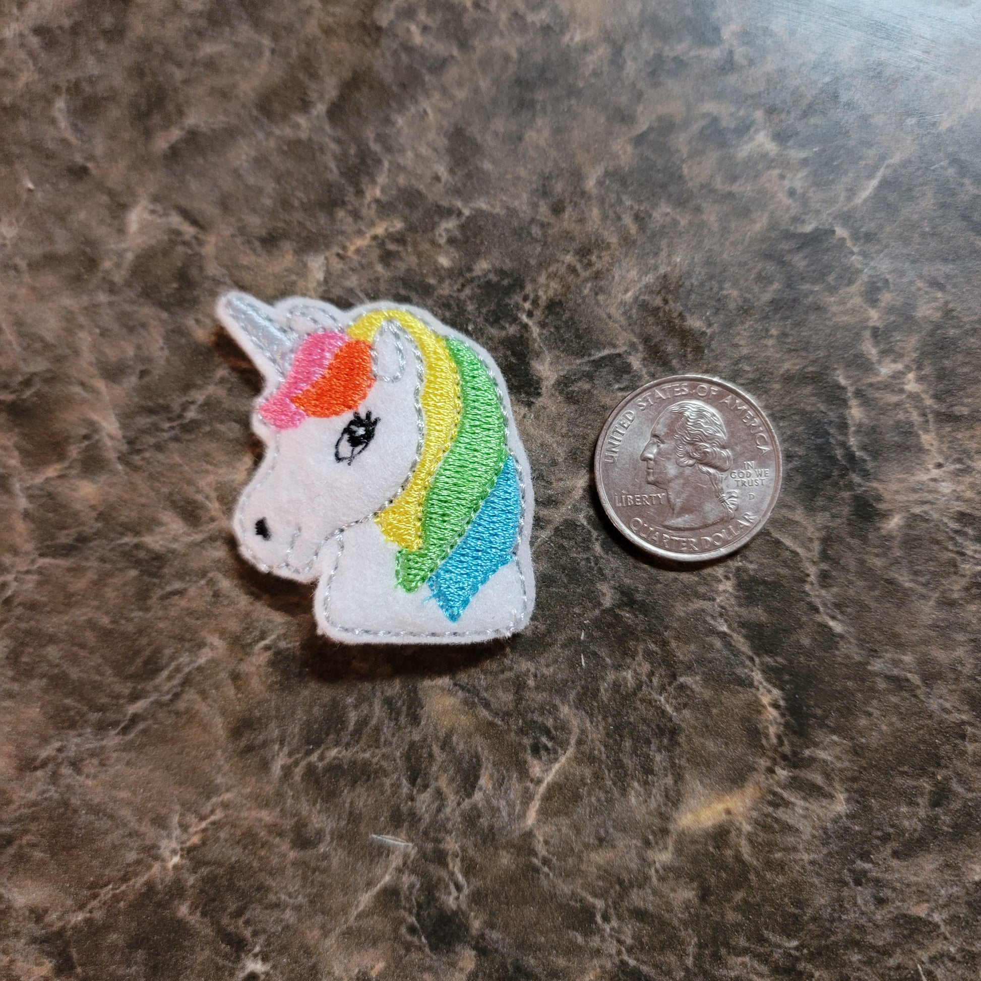 Embroidered Unicorn feltie secured on a 1.2 inch snap clip.