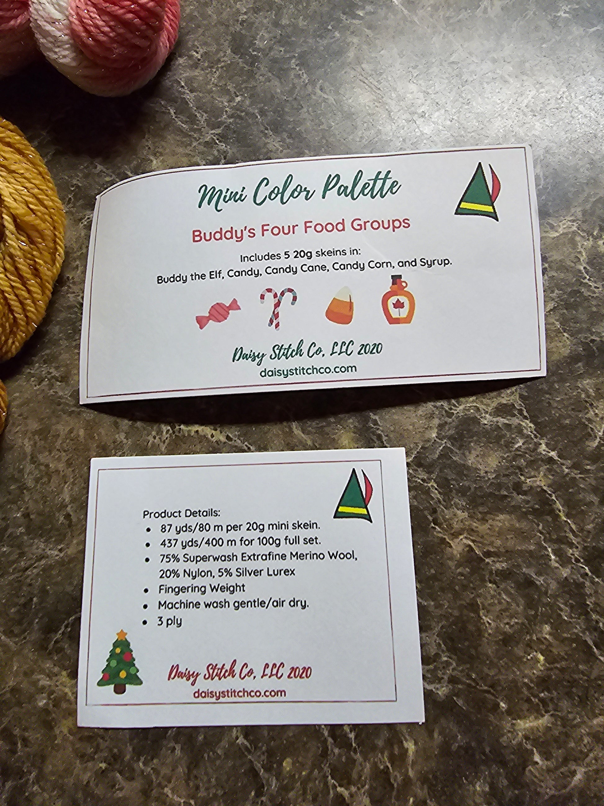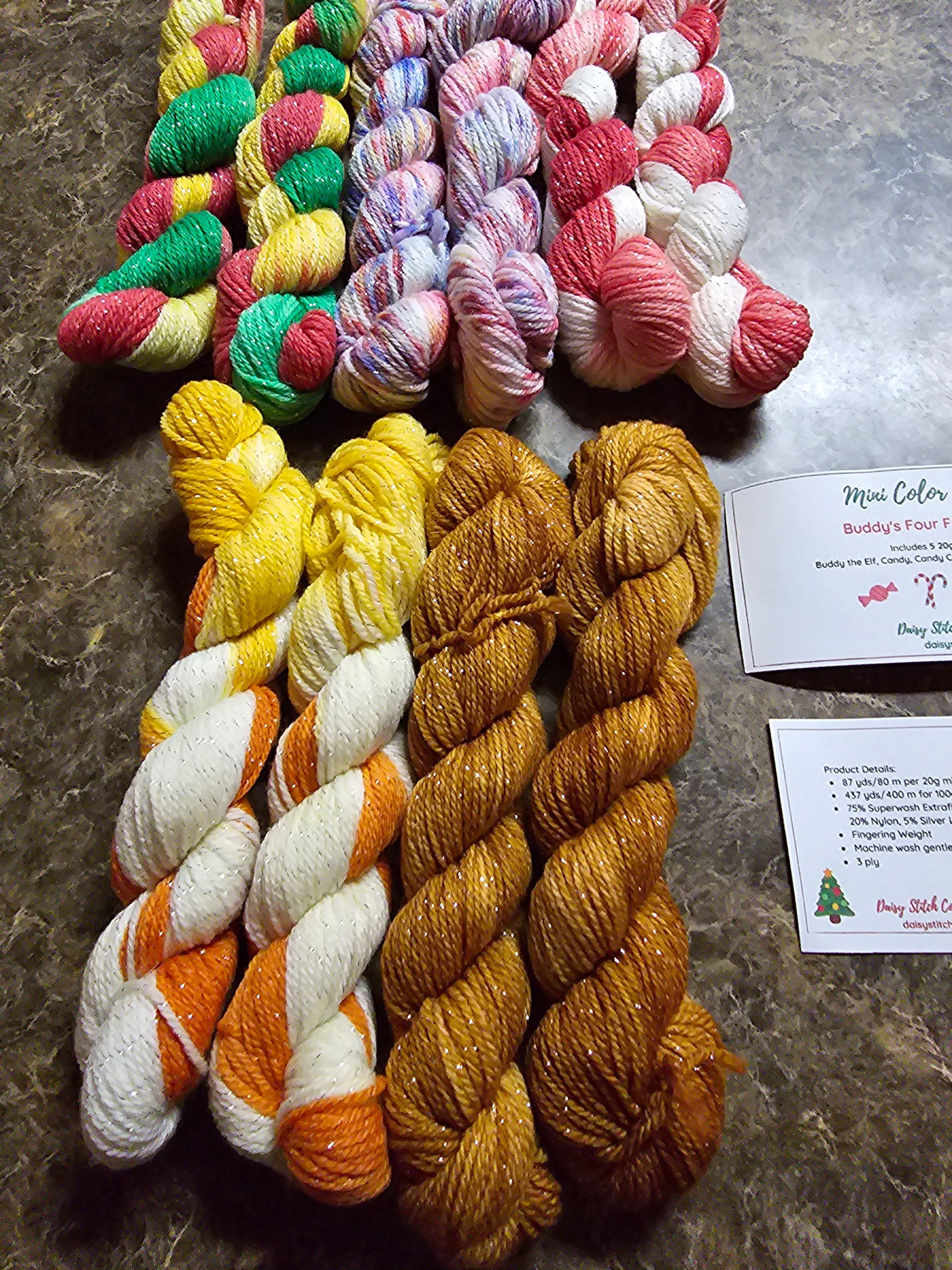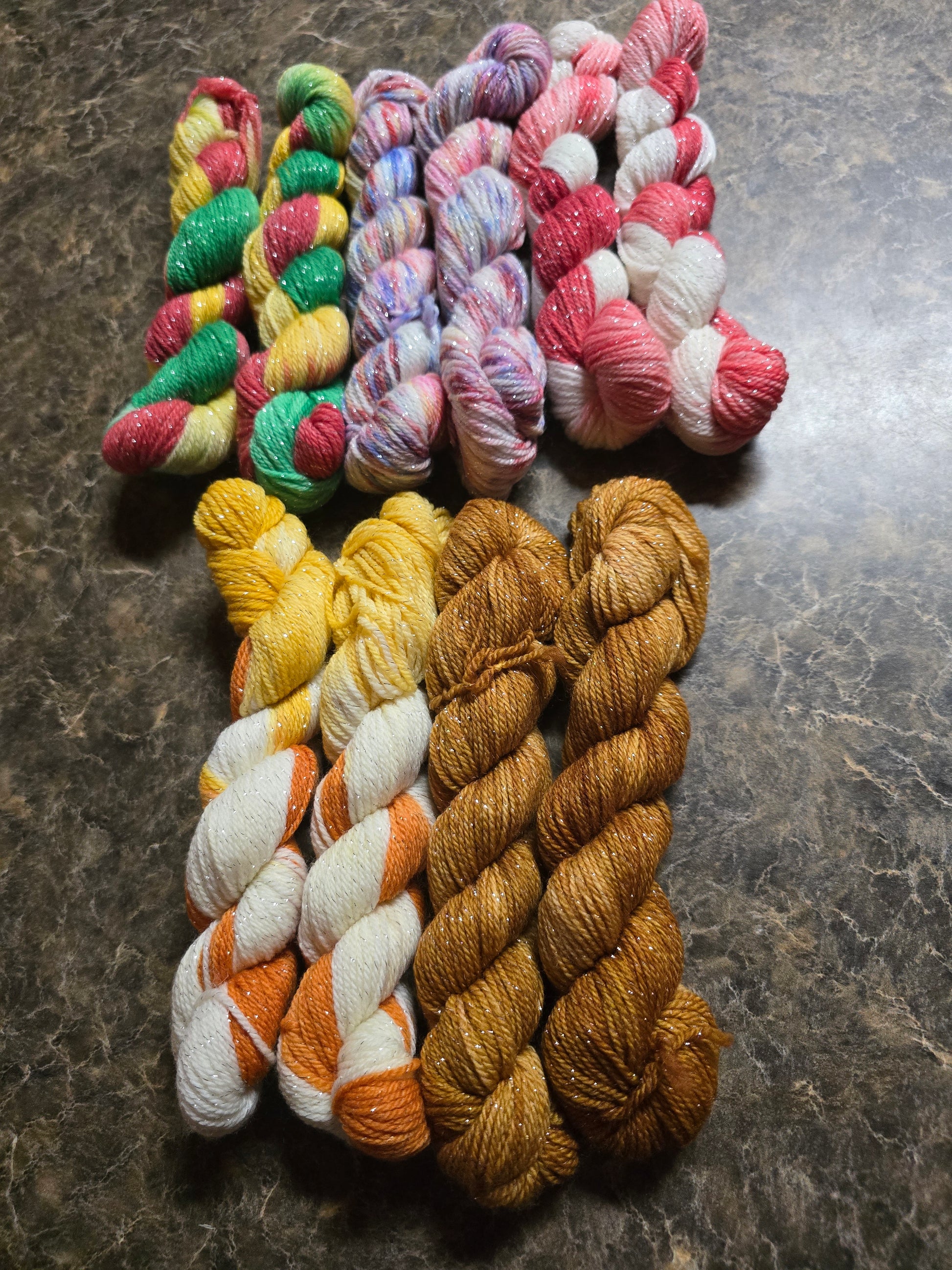 Yarnbase: 75/20/5 Superwash Merino/Nylon/Silver Stellina. 20g/87 yards per Mini skein.