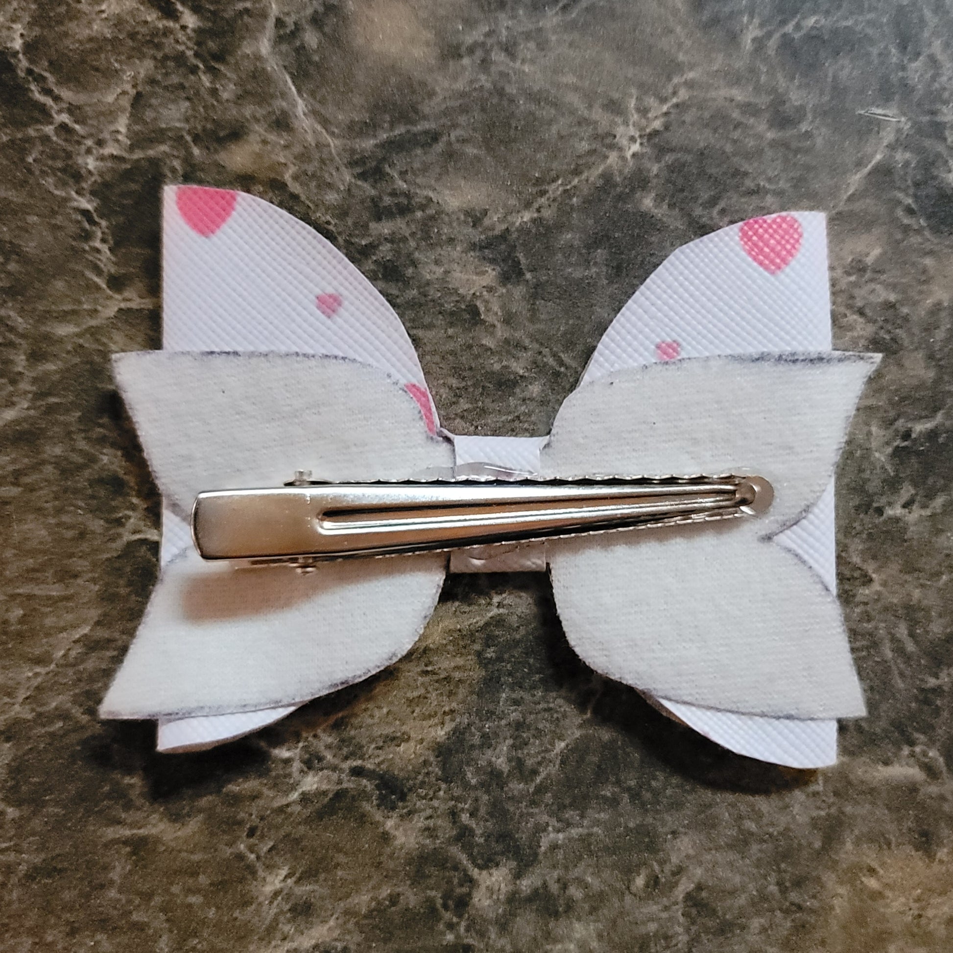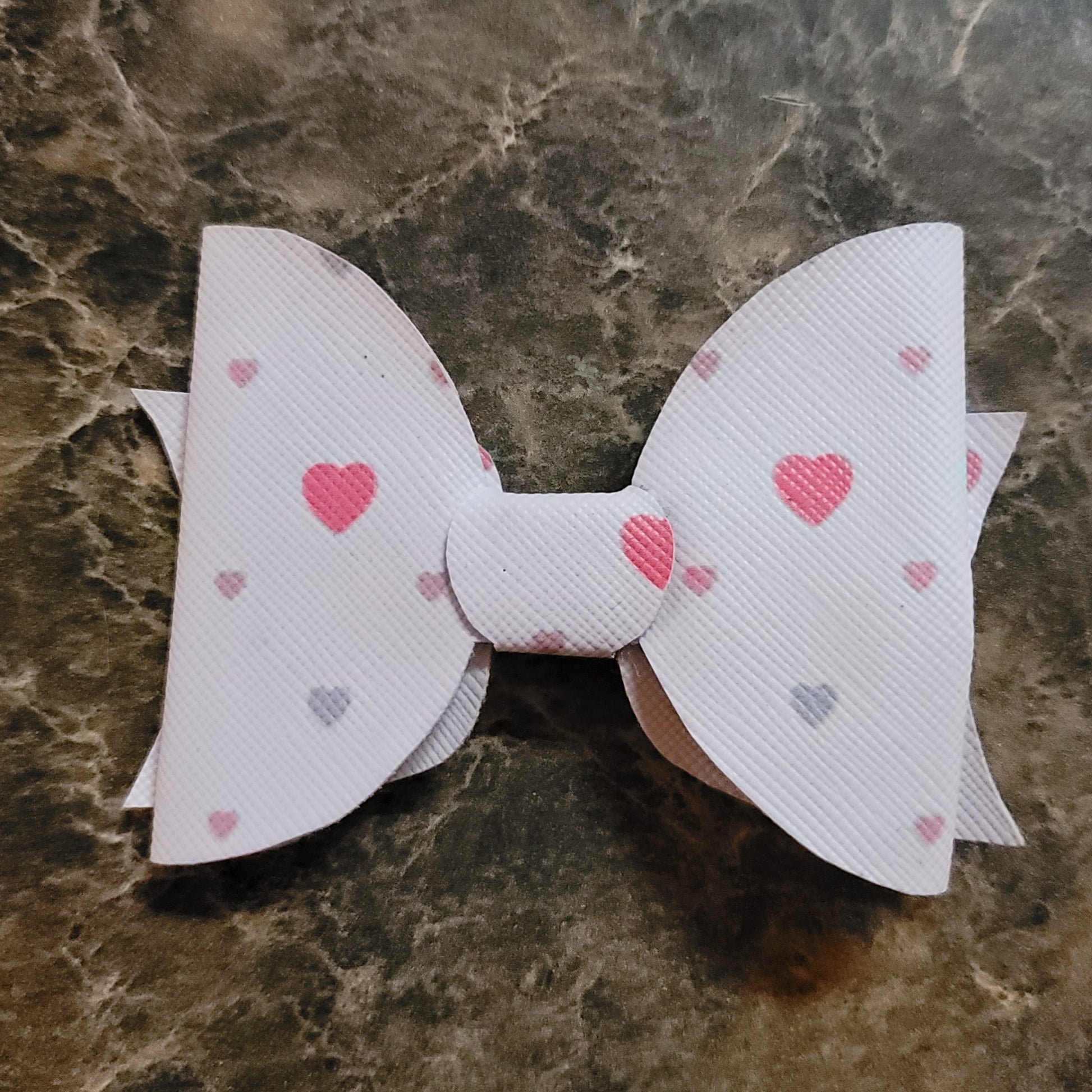White heart print faux leather. Medium bow secured on an alligator clip.
