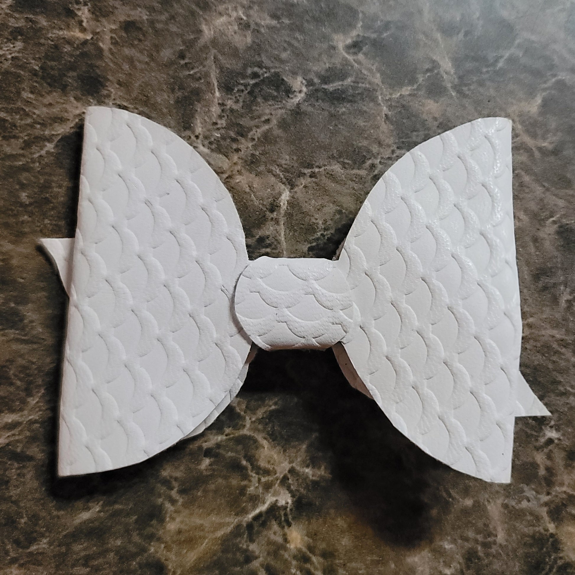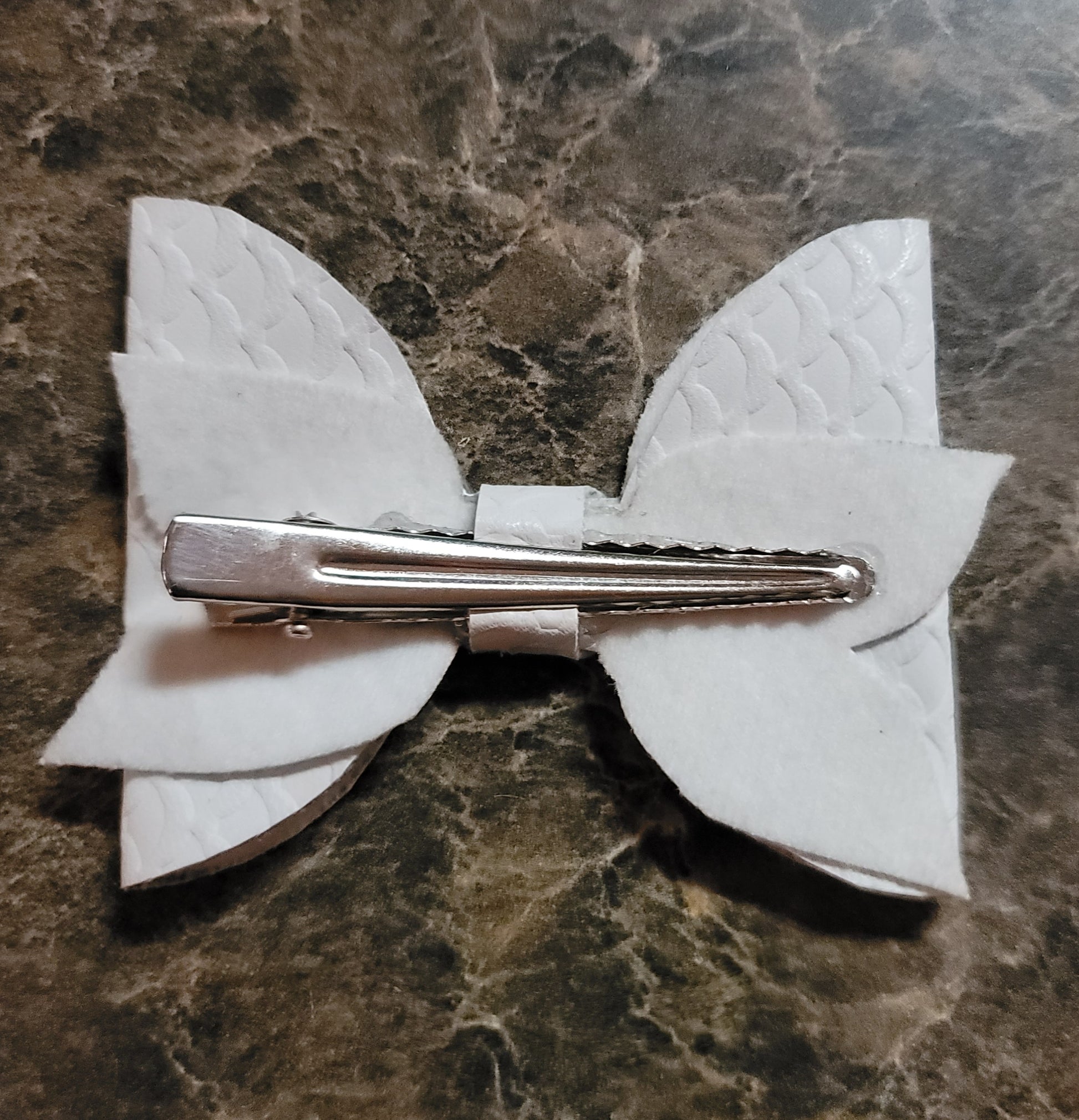 White texture soft faux leather. Medium bow secured on an alligator clip.