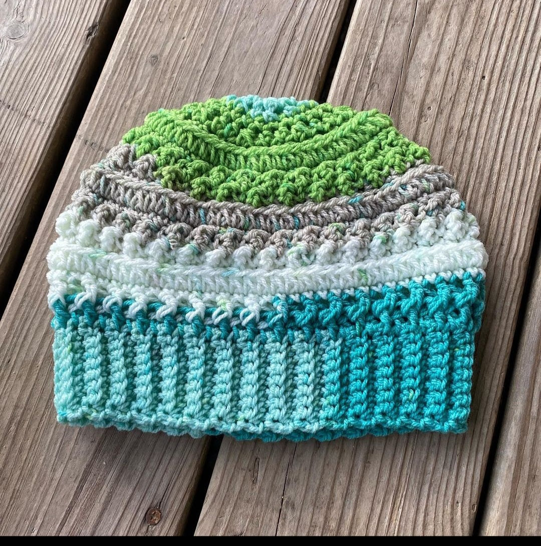 Hat measures 7.5 inches tall and has a 16 inch circumference. 2 inches of ease for stretch.
