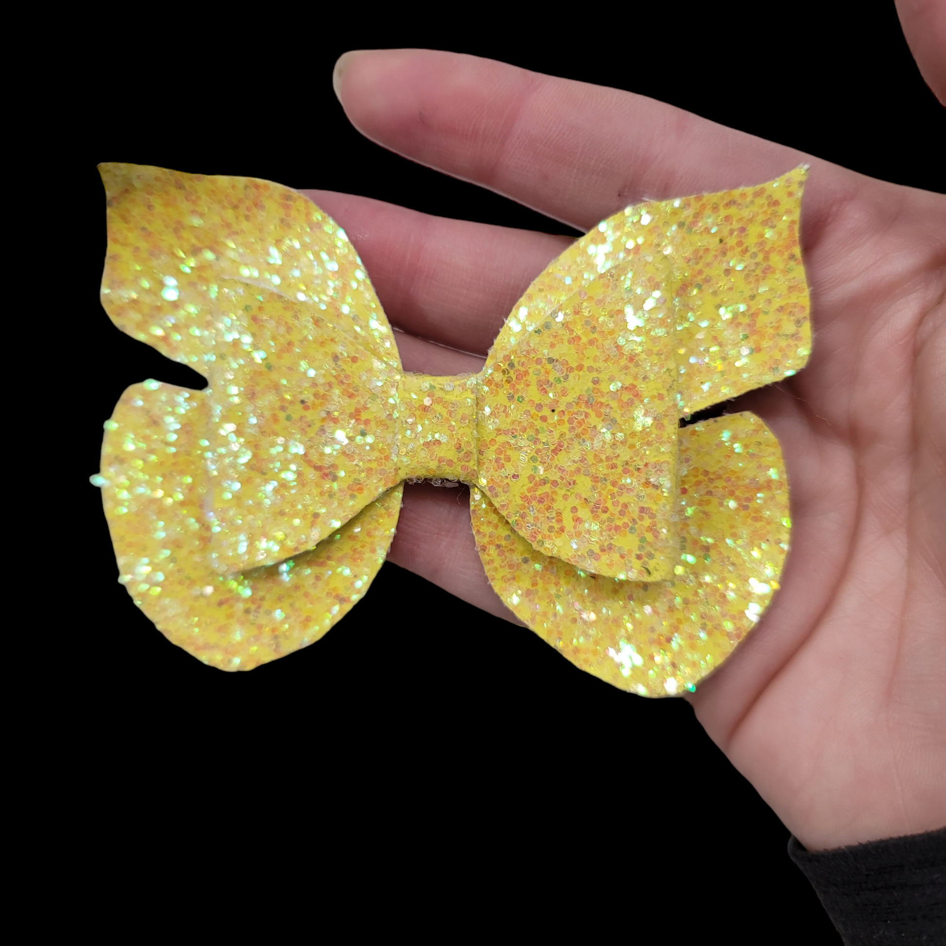 Bow is made with faux vegan leather and is secured on a 3 inch alligator clip.