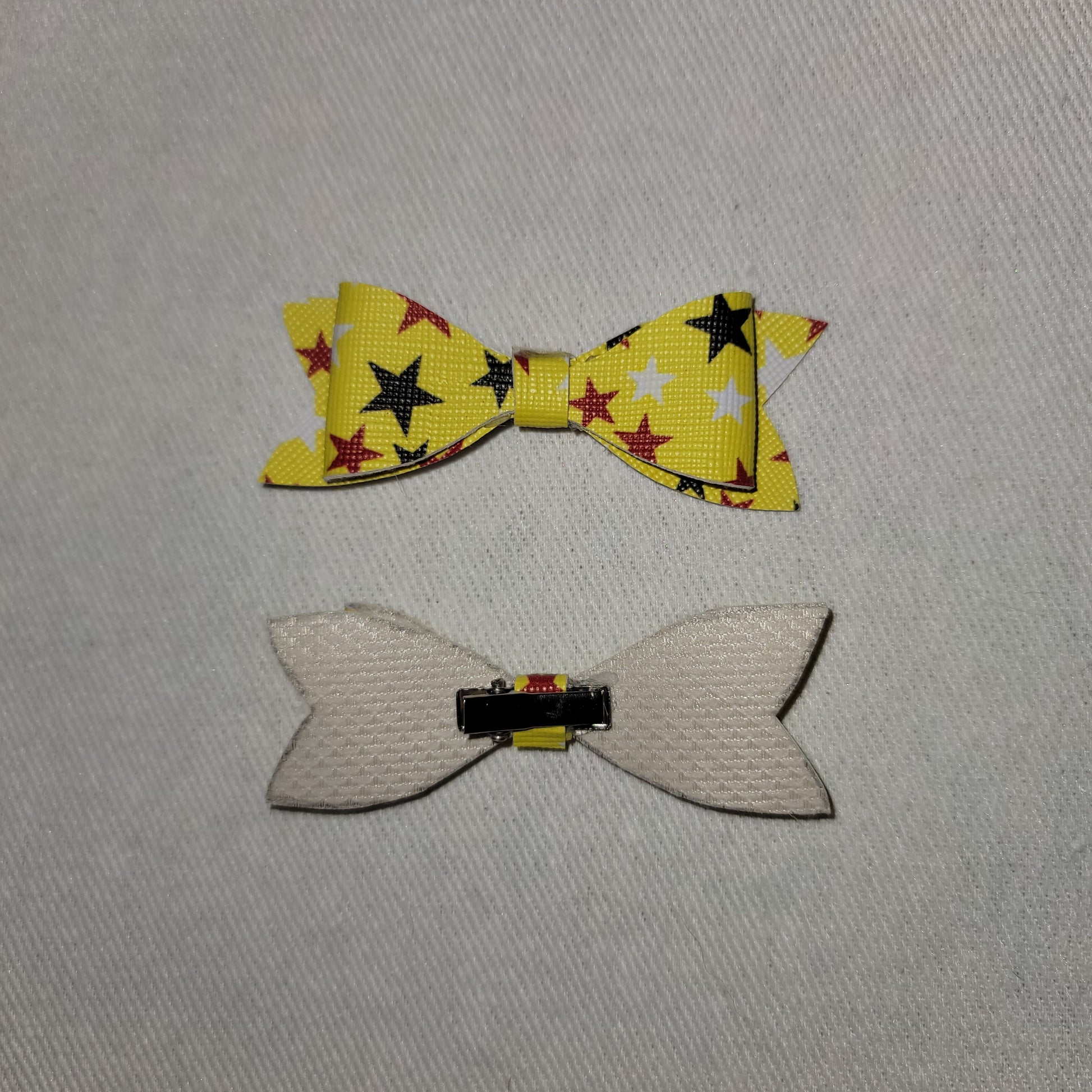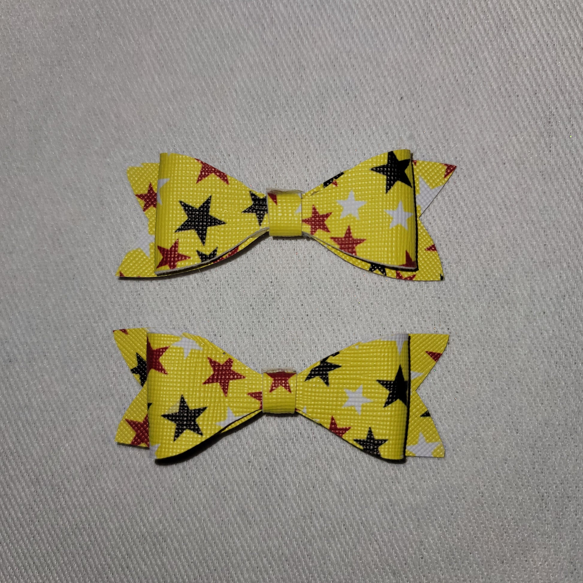 Yellow star print faux leather. Mini bows secured on alligator clips.